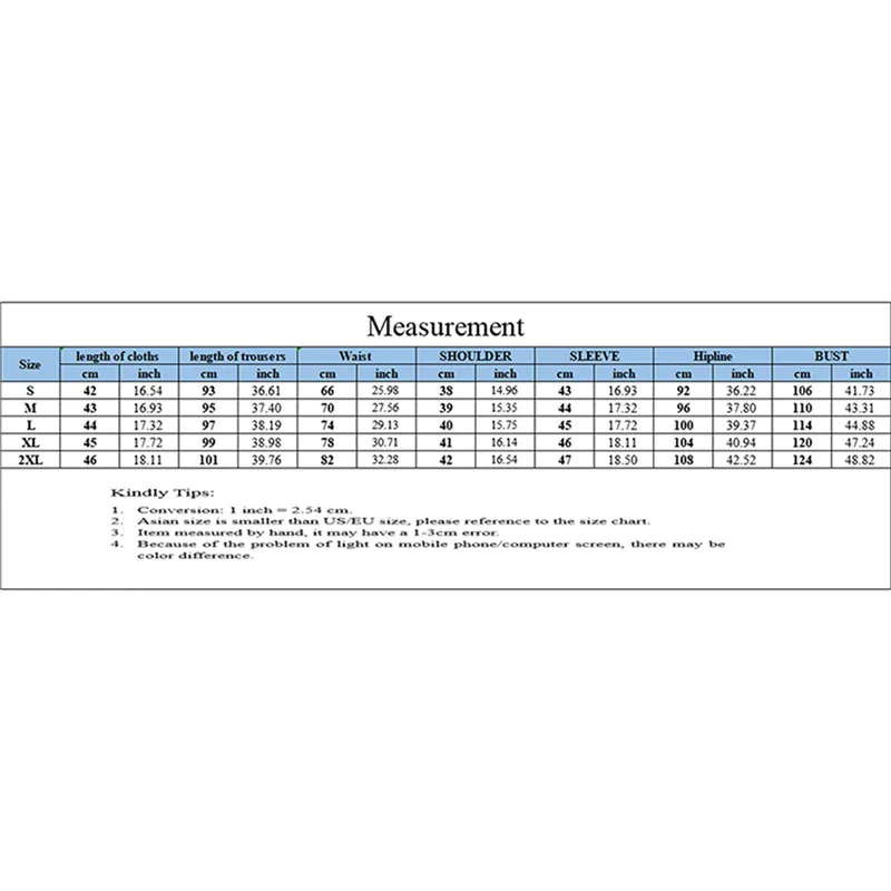 Размер: S,M,L,XL,2XLРазмер: S длина одежды: 42 см, длина брюк: 93 см, обхват талии: 66 см, ширина плеч: 38 см, длина рукава: 43 см, обхват бедер: 92 см, обхват груди: 106 смРазмер: M Длина одежды: 43 см, длина брюк: 95 см, обхват талии: 70 см, ширина плеч: 39 см, длина рукава: 44 см, обхват бедер: 96 см, обхват груди: 110 смРазмер: L длина одежды: 44 см, длина брюк: 97 см, обхват талии: 74 см, ширина плеч: 40 см, длина рукава: 45 см, обхват бедер: 100 см, обхват груди: 114 смРазмер: XL длина одежды: 45 см, длина брюк: 99 см, обхват талии: 78 см, ширина плеч: 41 см, длина рукава: 46 см, обхват бедер: 104 см, обхват груди: 120 смРазмер: 2XL Длина одежды: 46 см, длина брюк: 101 см, обхват талии: 82 см, ширина плеч: 42 см, длина рукава: 47 см, обхват бедер: 108 см, обхват груди: 124 см