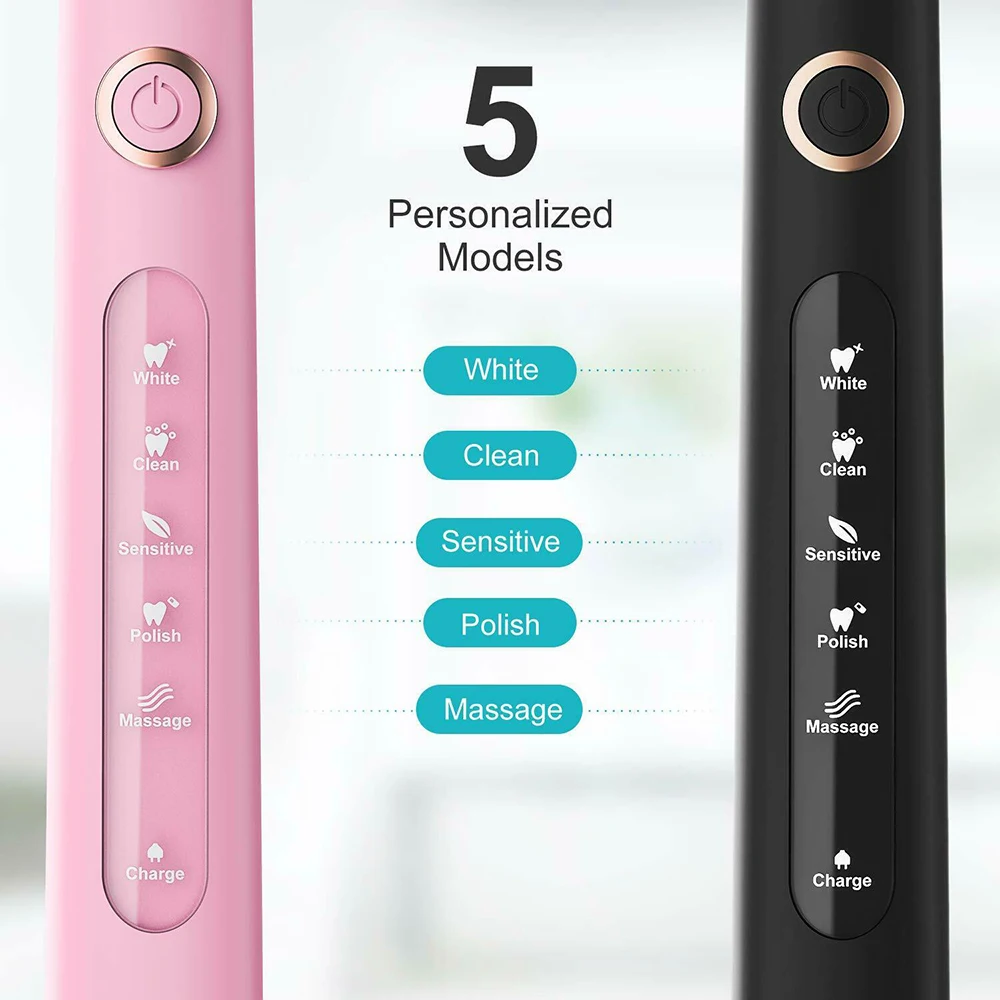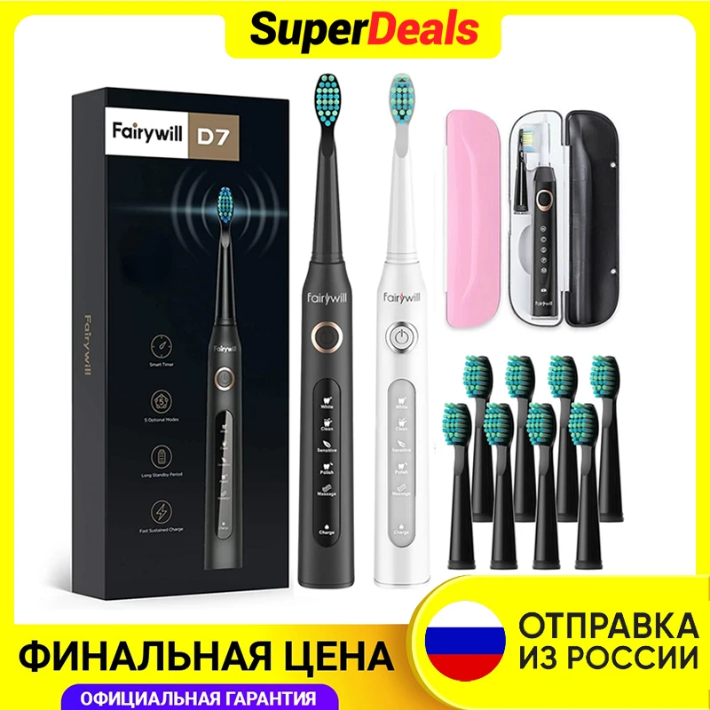 Зубная щетка Fairywill FW507 звуковая электрическая, перезаряжаемая с USB, водонепроницаемая, 5 режимов работы, сменные насадки в комплекте