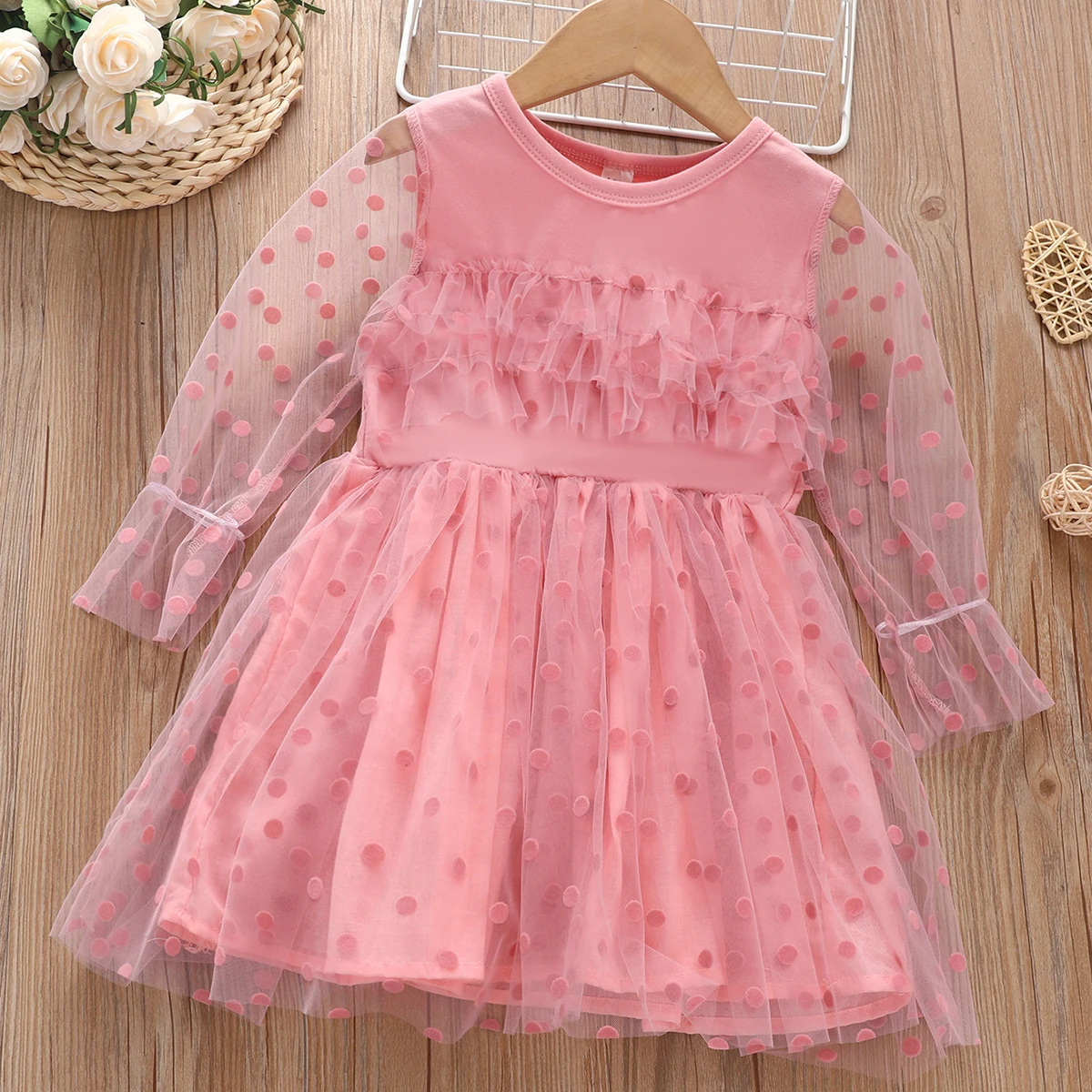 Детское платье принцессы в горошек с круглым вырезом и длинными рукавами