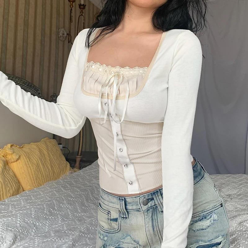 Кружевные лоскутные Y2K облегающие топы, футболка, женская мода, Ми...
