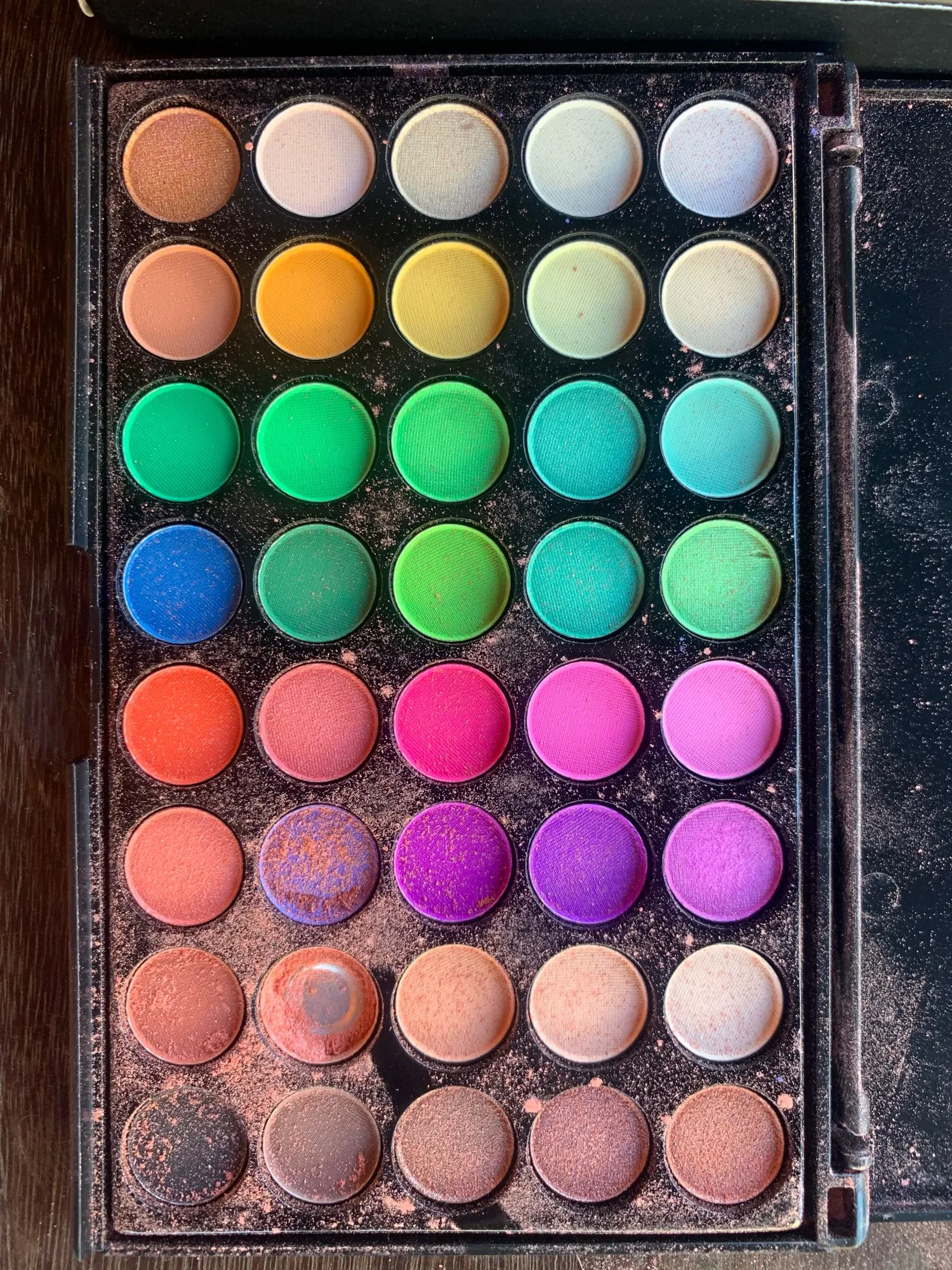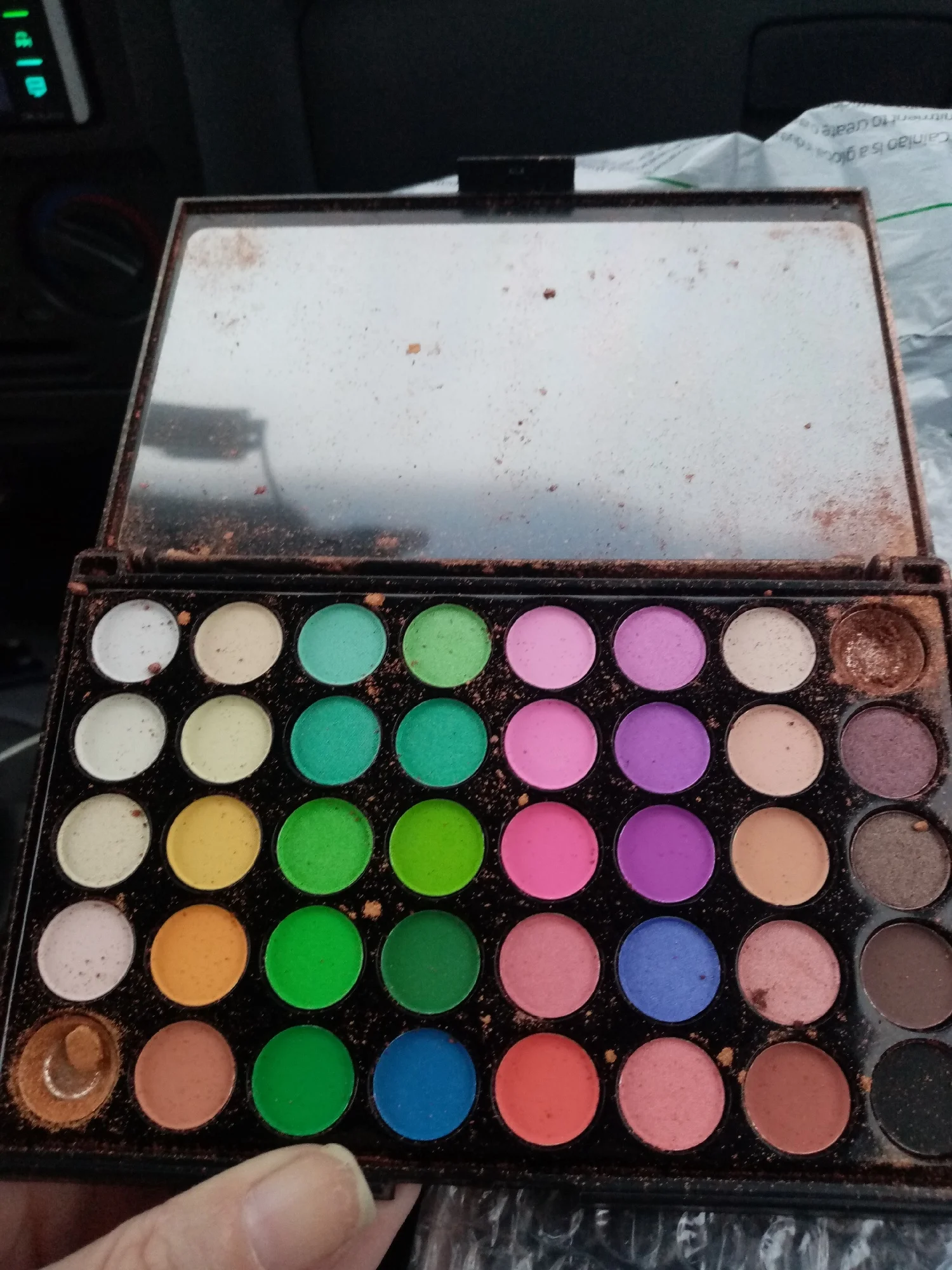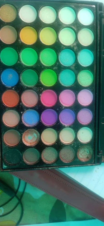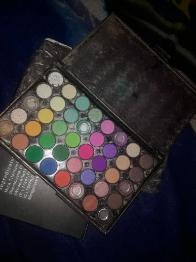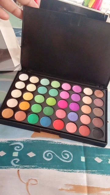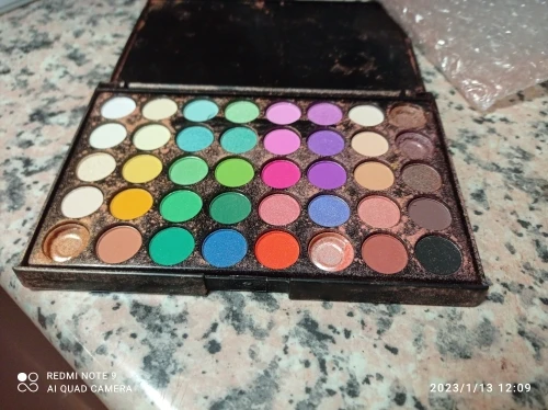 Заказ пришёл с очень большой задержкой и один из цветов пакически полностью выспался на остальные цвета. Грустно. Была ещё какая то проблема с адресом и посылка возвращалась из сорт центра обратно и заново отправлялась. Диаметр одного цвета в палетку 1.5 см.