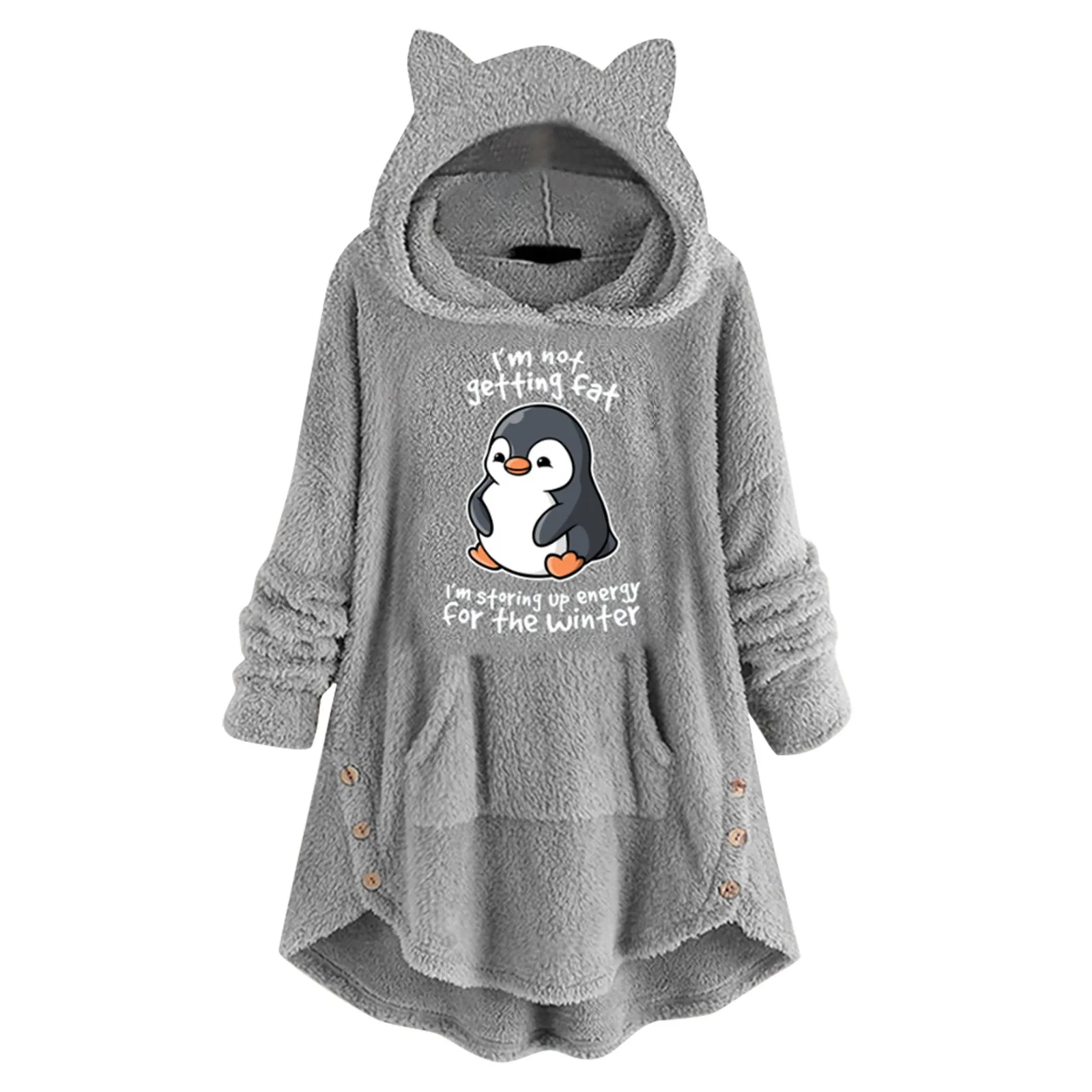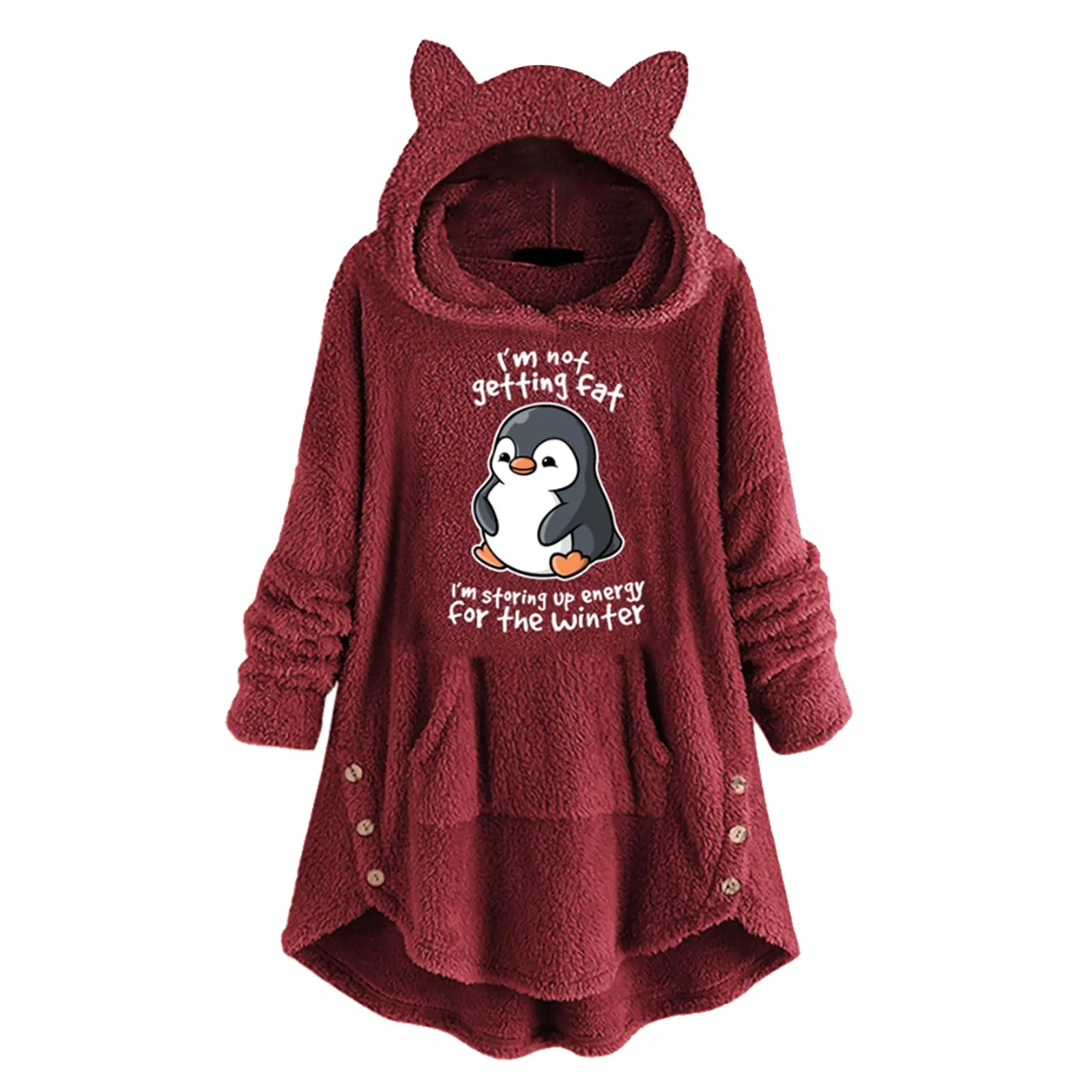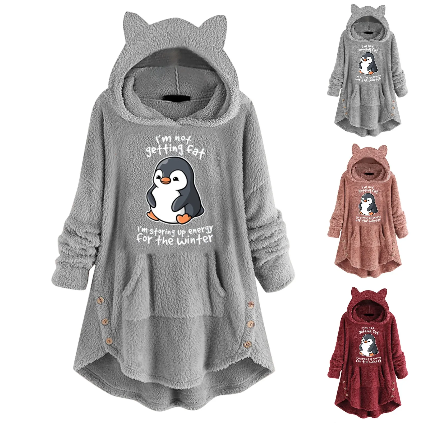 Женская флисовая толстовка с капюшоном, Милый Пуловер с вышивкой Пингвин и ушками, элегантный осенний смешной Повседневный утепленный Свитшот