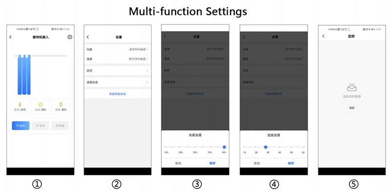 1. Регулярно открывайте и закрывайте шторы2. Граффити APP control3. Управляйте занавеской, чтобы быть полностью открытой/полуоткрытой или закрытой4. Датчик освещенности (автоматически закрывается, когда яркость больше, чем настройка)5. Датчик температуры (автоматически закрывается, когда температура больше установленной температуры)6. Поддержка одного открытия или двойного открытия (для двойного открытия требуется покупка посылка)7. Поддержка дистанционного управления (должен быть оснащен шлюзом)8. Поддержка сторонних вечерние смарт-динамиков (Alexa и Google Assistant), вам нужно купить другой сетчатый Bluetooth-совместимый шлюз
