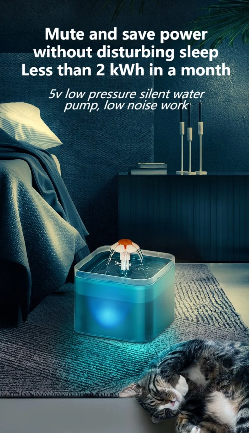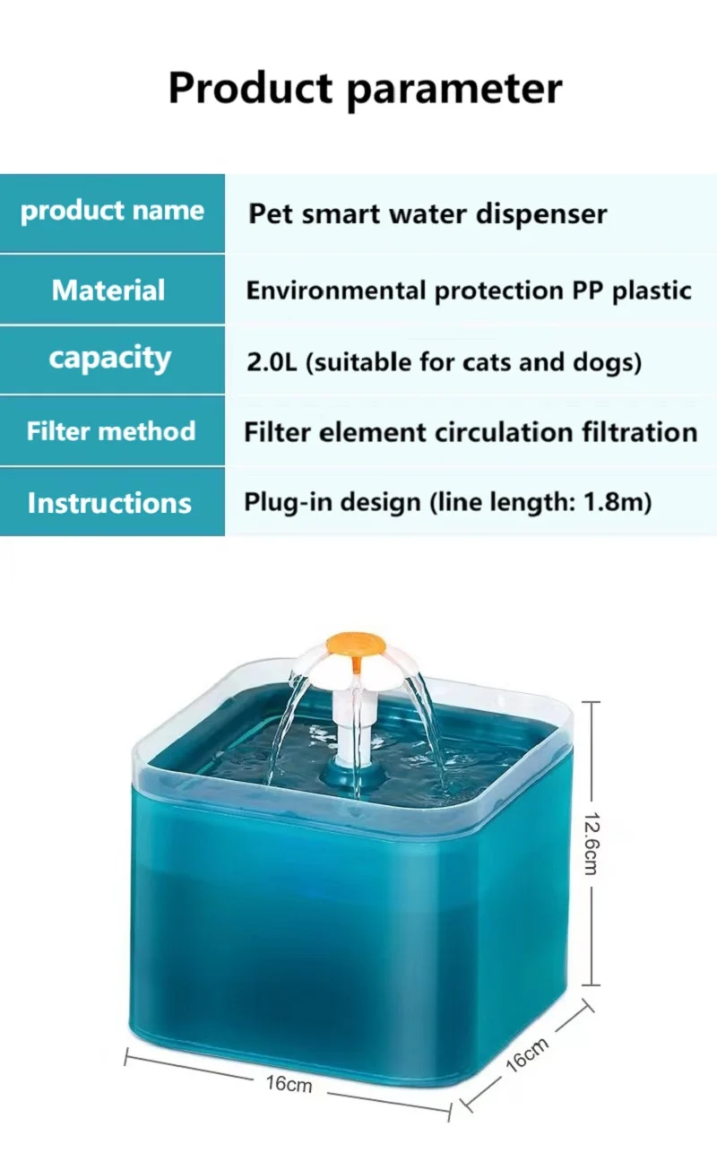 Параметры продуктаНазвание продукта: умный питьевой фонтан для домашних животныхМатериал: экологичный ПП пластикЕмкость: 2.0L (подходит для кошек и собак)Метод фильтрации: фильтрующий элемент циркуляции фильтрацииПрименение: вставная конструкция (Длина шнура: 1,8 м)Шаги установки1. Положите в фильтр хлопок 2. Положите в водяной насос 3. Прикрепите маленькую лампу 4. Пропустите usb-кабель 5. Налейте в воду 6. Положите в лоток фильтра 7. Положите в фильтр 8. Пропустите usb-кабель 9. Положите в лоток фильтраТри способа пить воду для удовлетворения различных потребностей домашних животныхФонтанный стиль, фонтан + весенний стиль, фонтанный стиль1. Бережная стирка светодиодный Ночной светильник, легко отследить уровень воды, при отсутствии солнечного светильник ing в ночное время, светодиодный Ночной светильник может наблюдать за уровнем воды и привлекают домашних животных, чтобы пить воду2. Тихая экономия энергии, не беспокоя сон, менее 2 кВт · ч в месяц, 5 в низкое напряжение бесшумный водяной насос, низкий уровень шума3. Естественный поток воды, Циркулирующая вода может стимулировать интерес кошки и увеличить количество питьевой воды4. Смягчает качество воды, очищает источник воды, держится подальше от мочевых камней, избегайте скопления мусора волос, чрезмерных ионов кальция и магния, скопления накипи и суровой воды5. Четырехкратная система эволюции, отвергает жесткую воду, смягчает качество воды, задерживает мелкие частицы, волосы, остаточный хлор, ионы тяжелых металлов, специфический запах и Другие журналы для защиты здоровья домашних животных