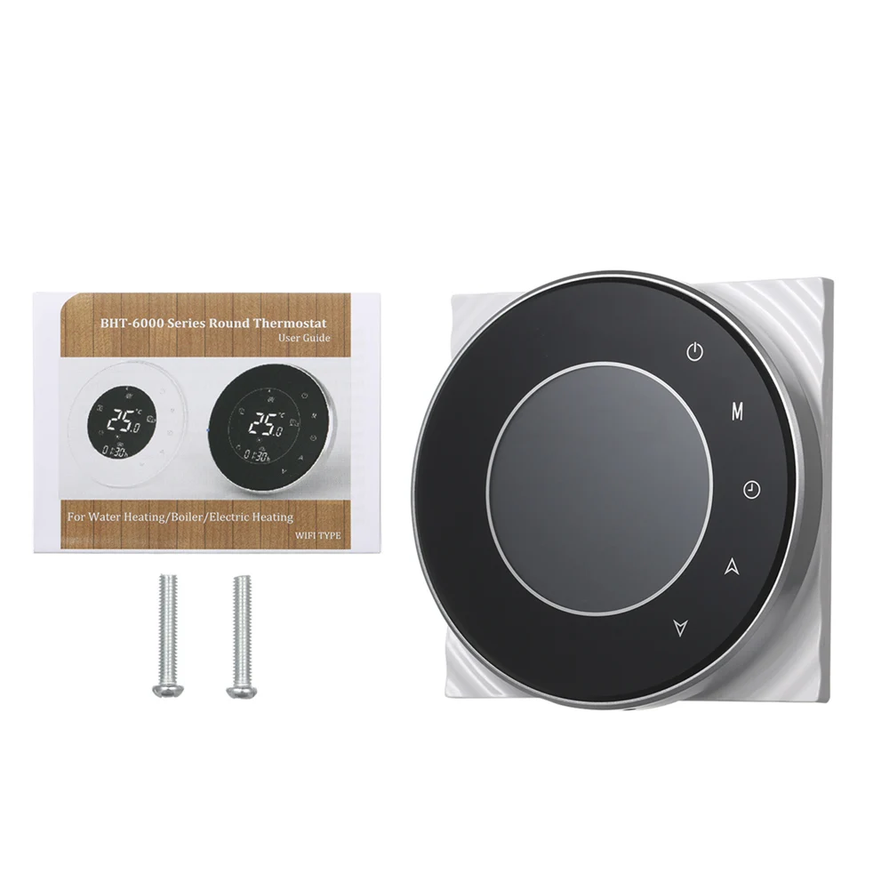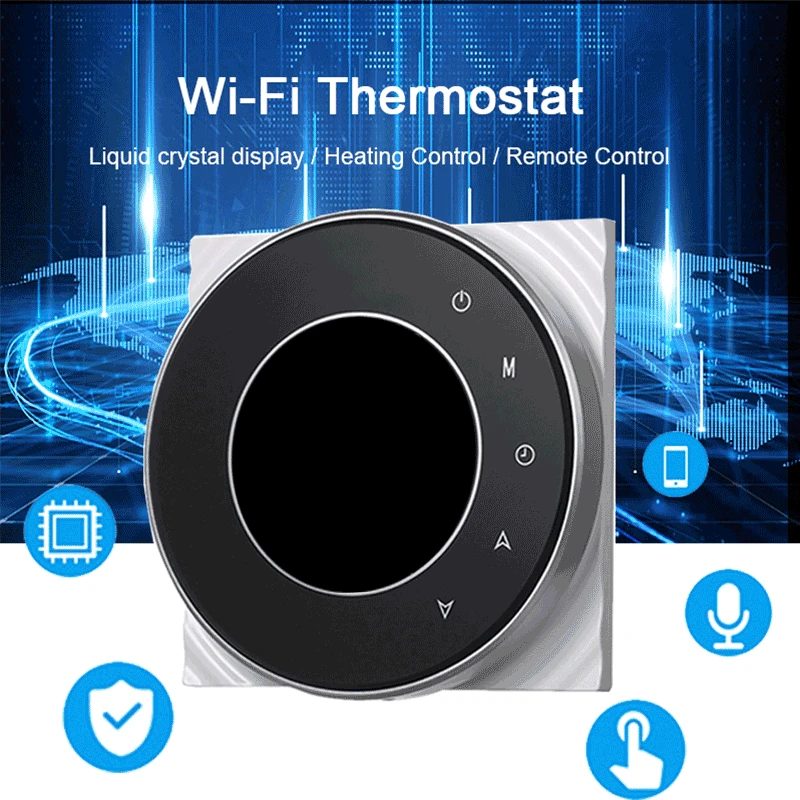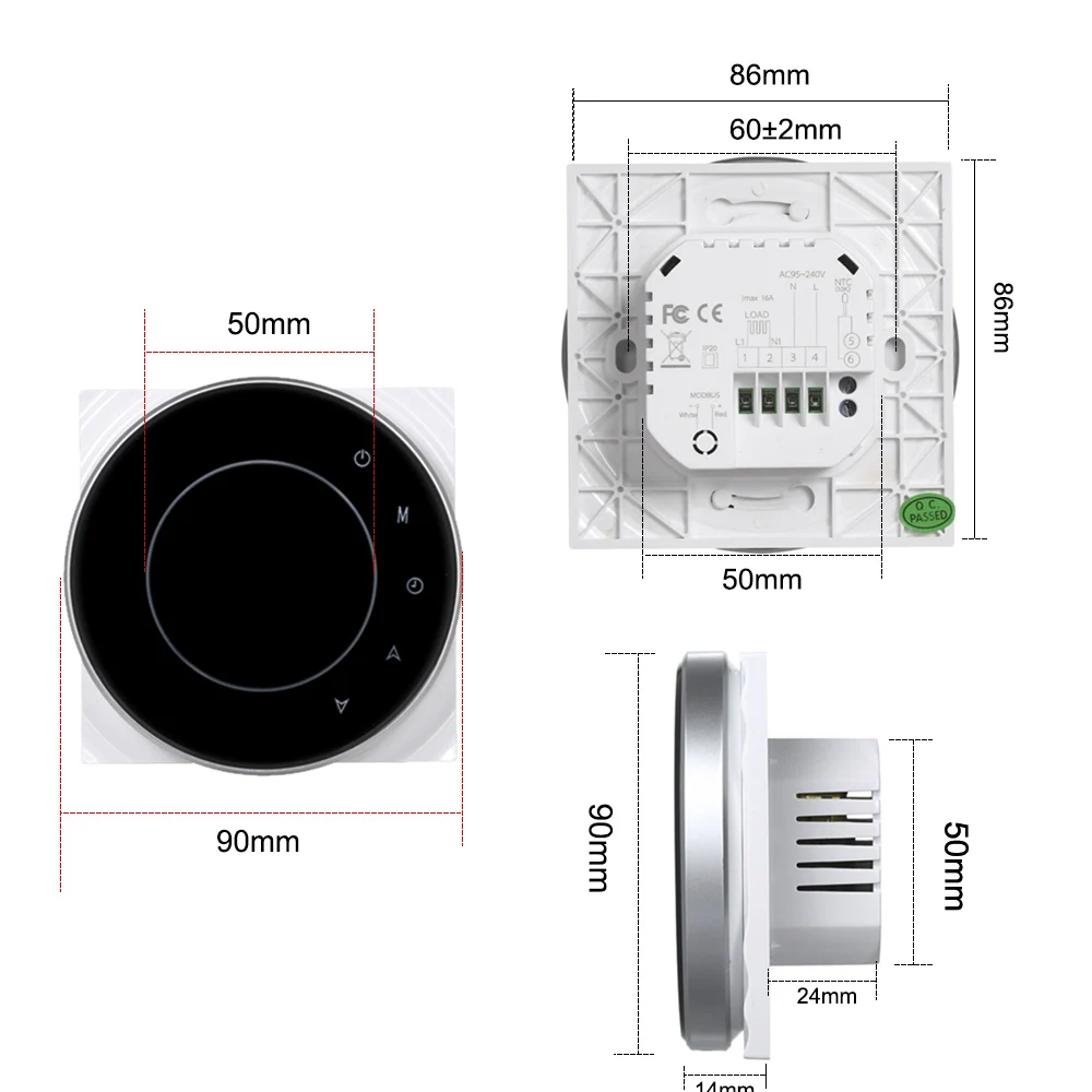 Технические параметры Источник питания: 95 ~ 240 В переменного тока, 50 ~ 60 ГцТок нагрузки: 3A (водонагревание/водонагреватель/газовый котел) 16A (электрическое отопление)Сенсор: NTC3950,10kТочность: ± 0,5 ℃ или ± 1 ℉Установите температуру. Диапазон: 5-35 ℃Температура экрана. Диапазон: 5 ~ 99 ℃Температура окружающей среды. : 0 ~ 45 ℃Влажность окружающей среды: 5 ~ 95% RH (без конденсации)Температура хранения:-5 ~ 45 ℃Мощность Потребляемая мощность: <1,5 WОшибка синхронизации:< 1%Материал корпуса: поликарбонат + АБС (огнестойкий)Установочная коробка: 86*86 мм квадратная или европейская 60 мм круглая коробкаПроволочные выводы: провод 2 × 1,5 mm2 или 1x2,5 mm2Класс защиты: IP 20Кнопки: емкостные сенсорные кнопки Особенности продукта