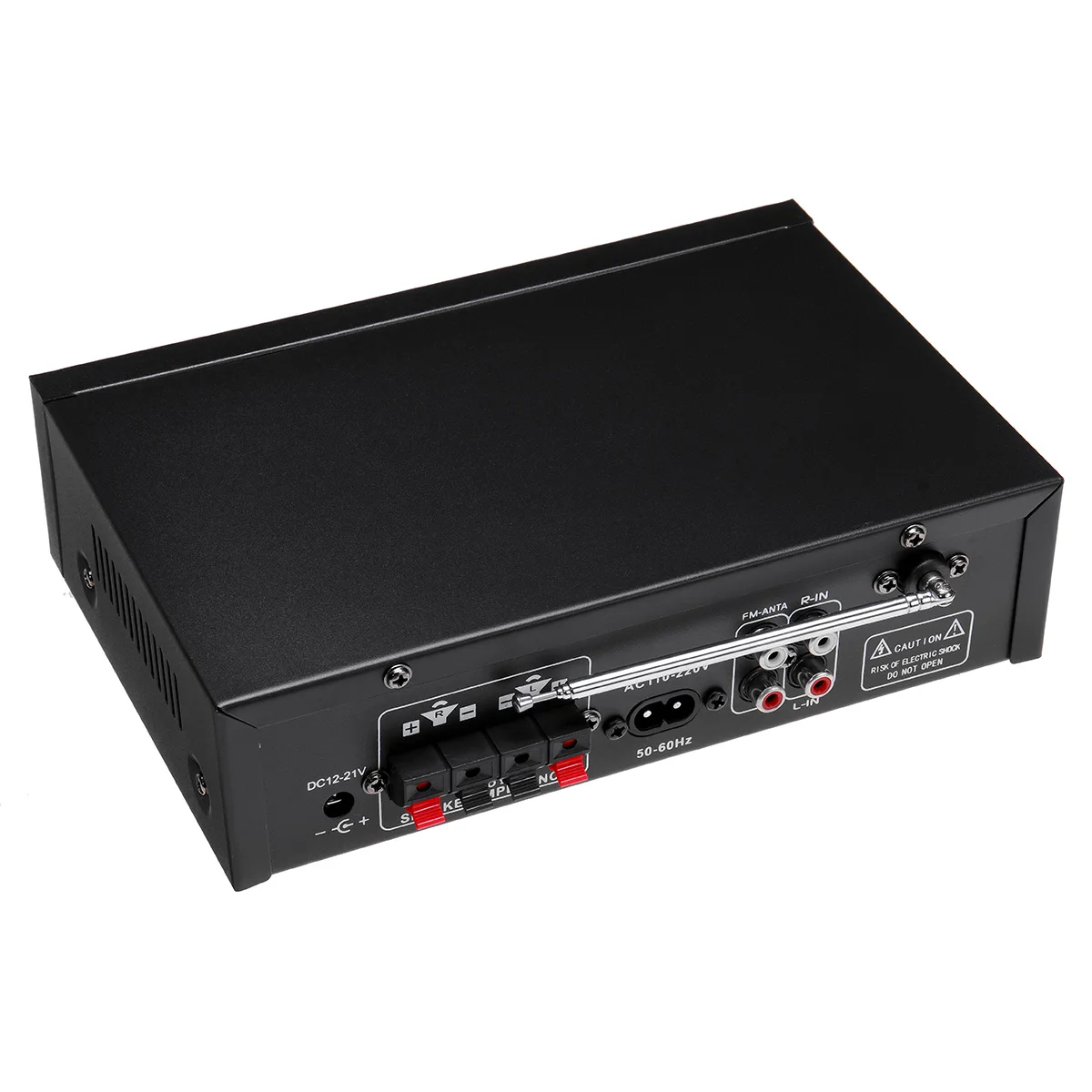Особенности:● Мини HIFI Цифровой bluetooth аудио усилитель мощности.● С высокими частотами, басами и регулятором громкости, он очень прост в использовании.● Низкое искажение обеспечивает более четкий, сильный и мощный звук.● С многофункциональным беспроводным пультом дистанционного управления.● Обладает низкой теплотворной способностью, светильник вес и длительный срок использования.● Два усилителя мощности можно подключить беспроводным способом для реализации беспроводного подключения нескольких наборов динамиков.● Он имеет цветной дисплей и мощный цифровой усилитель мощности.● Блок питания совместим и может использоваться при напряжении 12 В, 110 В и 220 В.