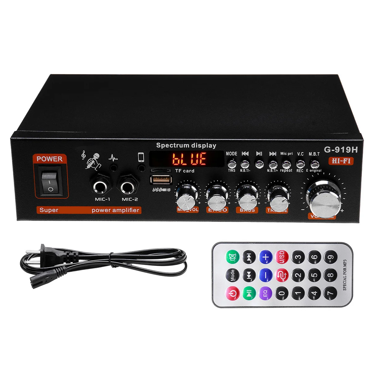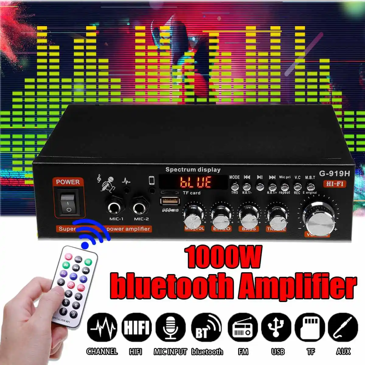 Характеристики:Цвет: черныйВилка (опция): штепсельная вилка европейского стандарта/штепсельная вилка американского стандартаМатериал: пластикРазмер (Д * Ш * В): около 23*15*6 см/9,1*5,9*2,4"Коэффициент искажений: 0.01%Bluetooth: поддержкаМощность: 1000 ВтSNR: 98дБЧастота: 20-20 кГцСопротивление: 4ΩНапряжение: 12/220V