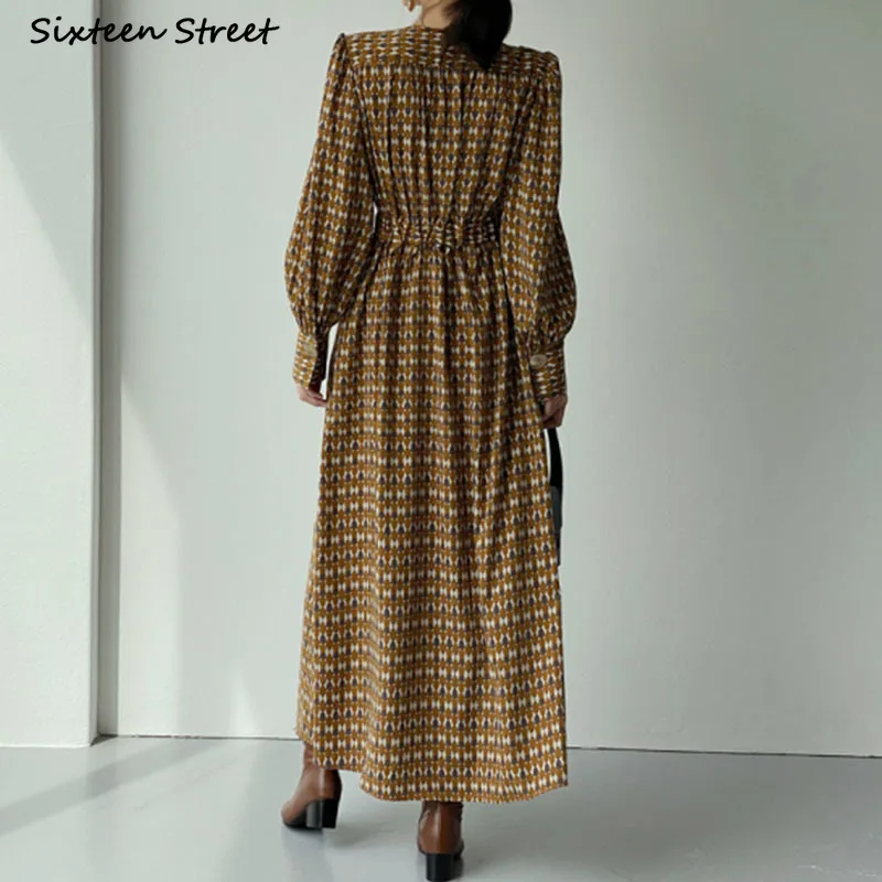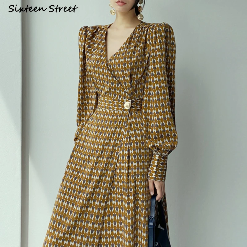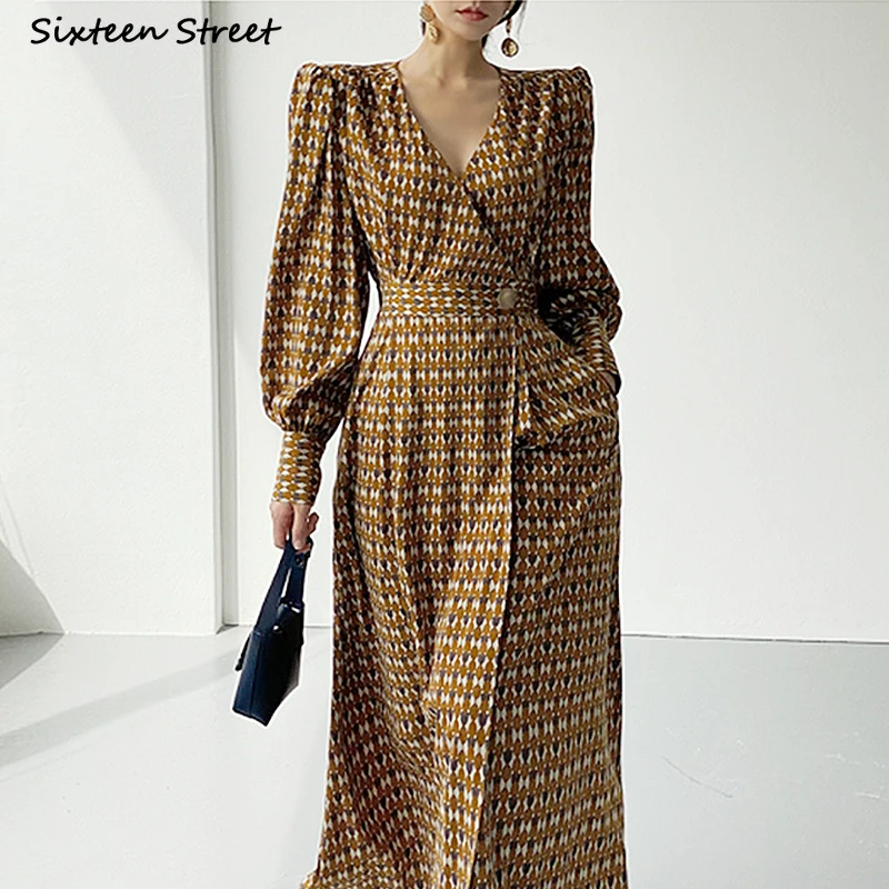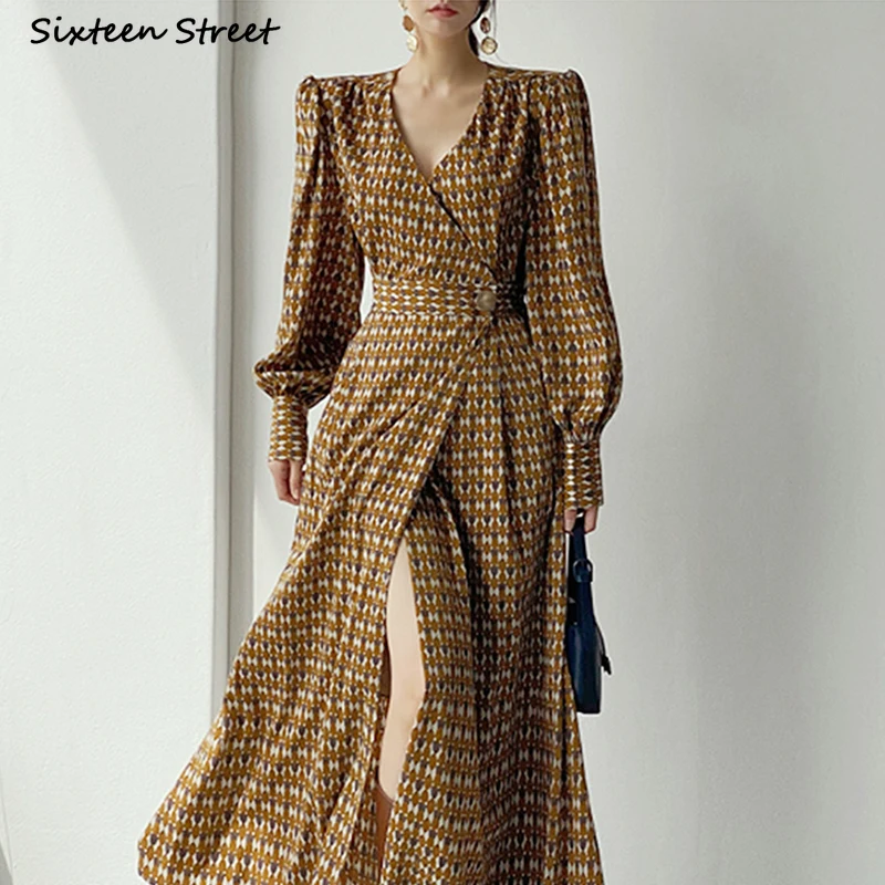 Платье-макси с V-образным вырезом и длинным рукавом, осень 2021