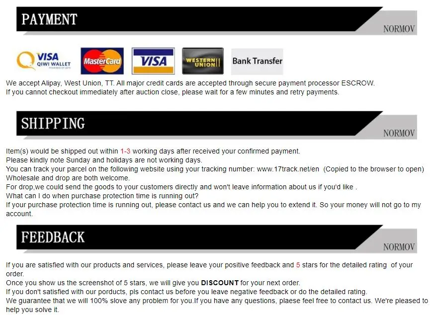 1. Могу ли я разместить смешанный заказ?О: Да, вы можете смешивать цвета и стиль в наших товарах на складе.2. Как посылка товара?О: Если у клиента нет специального запроса, мы будем использовать стандартную упаковку.Если вам нужна специальная упаковка, пожалуйста, укажите их в своей электронной почте. Мы хотели бы изготовить заказчику указанную упаковку.3. Могу ли я получить скидки?О: Да, для больших заказов, старых клиентов и частых клиентов, мы даем разумные скидки.4. Как я могу заплатить их?О: T/T, Western Union, кредитные карты, наличные деньги приемлемы, поэтому просто сообщите нам, что вам легко.5. Как разместить заказ?О: пожалуйста, установите заказ онлайн, 1, выберите модели и Кол-во; 2, добавьте в корзину; 3, найдите и нажмите логотип корзины; 4, нажмите ПЕРЕЙТИ В корзину; 5, не забывайтеДля использования купона; 6. Важно указать адрес и транспортную компанию.6. Как мы можем получить товар?О: если количество заказа не очень большое, мы отправим его вам Экспресс-доставкой, такой как Fedex,DHL,TNT,UPS,ARAMEX или EMSИ т. д.Если заказ большой, мы советуем вам использовать воздушные перевозки или морские перевозки. FOB порт может быть Нинбо, Шанхай, Гуанчжоу или Шэньчжэнь7. Могу ли я добавить свой логотип на продукт?О: Да, мы можем добавить ваш логотип на продукт.8. Можете ли вы сделать мой дизайн?О, да, OEM приветствуется, пожалуйста, не стесняйтесь присылать нам фотографии или ваши образцы.