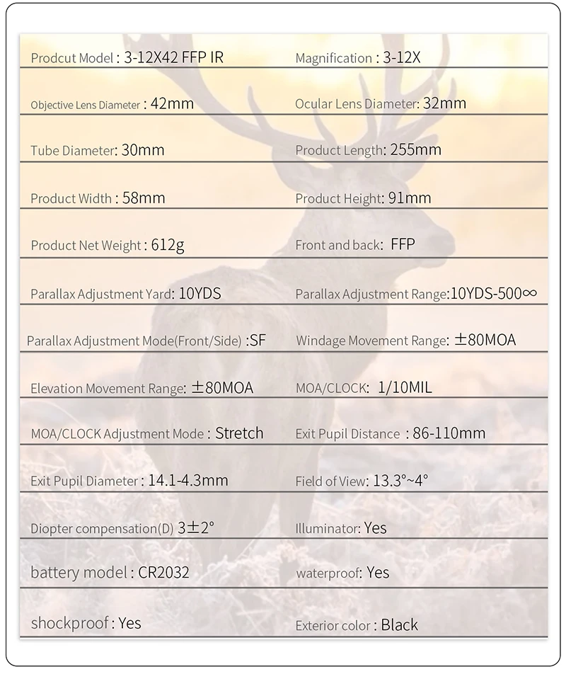 1. Водонепроницаемый, ударопрочный, противотуманный2.FFP-первая Фокусирующая плоскость3. Все полностью Многослойные линзы4. Травленная стеклянная красная и зеленая светящаяся сетка5. Крепление picatinny/ weaver6. Длинный рельеф глаз и широкий угол7.windage/elevation с нулевой блокировкой и нулевой сбросом