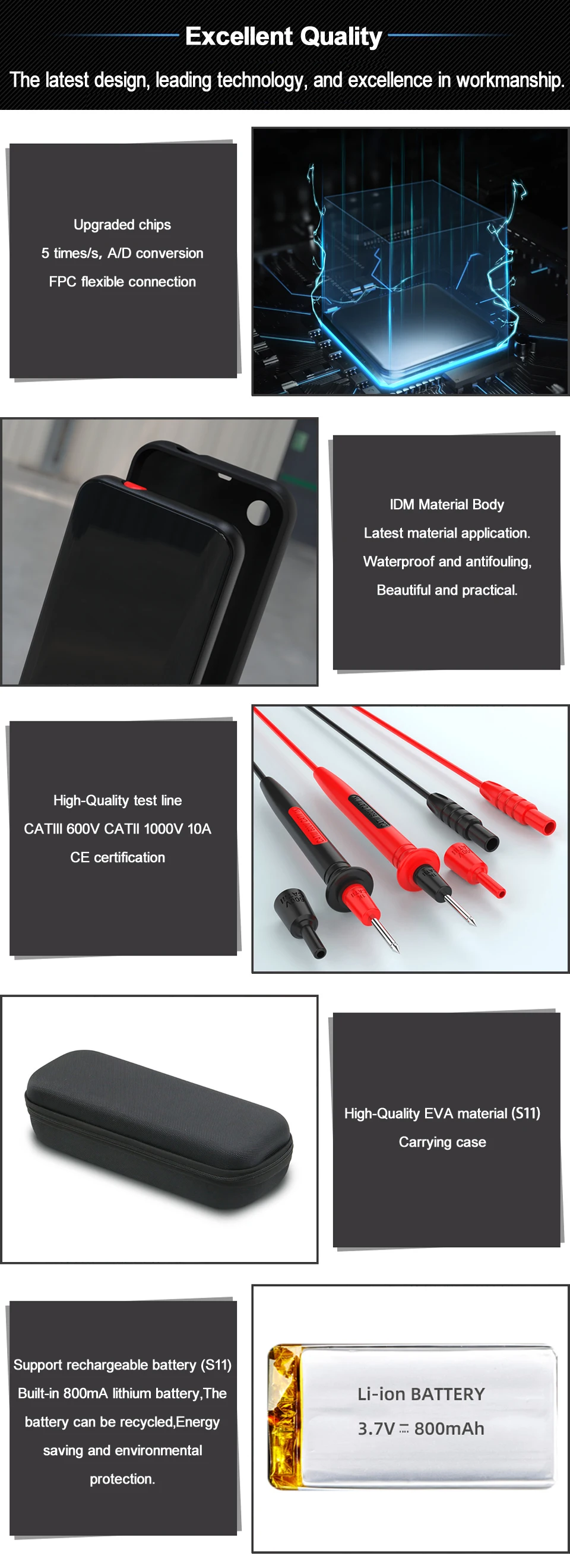 1. Цельный бесшовный внешний вид2. Боковая кнопка работы, похожая на мобильный телефон3. Независимый подключаемый тестовый свинец4. Широкий диапазон измерений5. Сочетание умного мультиметра + детектора напряжения5. Большой обратный дисплей + цветной дисплей6. Гладкое и беспроблемное измерение сПерезаряжаемая литиевая батарея