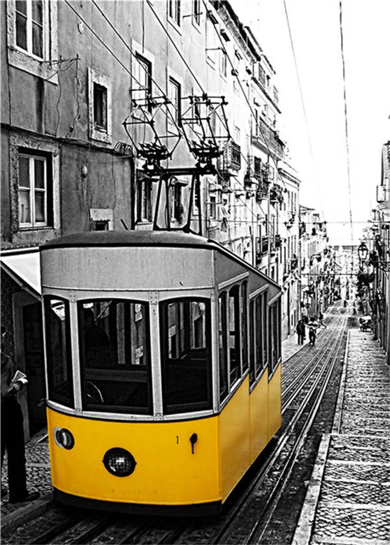 Пейзаж на холсте, настенное искусство, черно-белый, желтый автобус,...