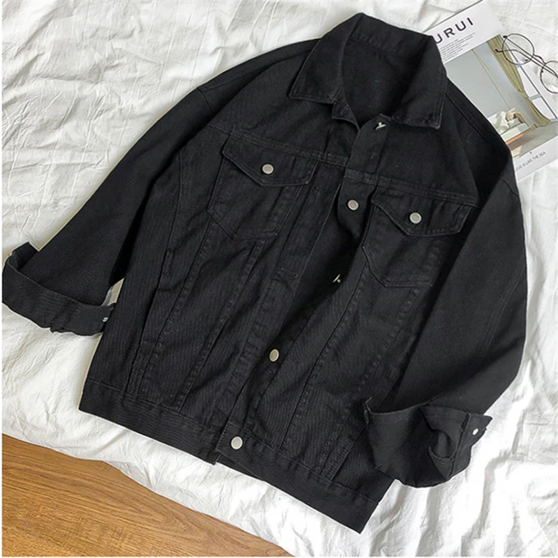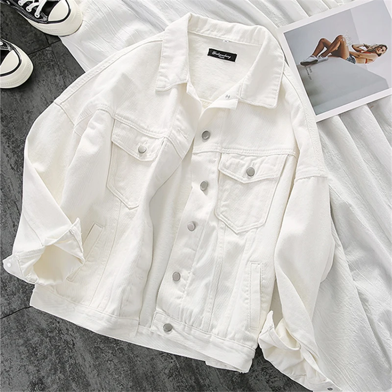 Белая джинсовая куртка, женские куртки осень 2021, Женское пальто, джинсовое пальто, новое, сплошной цвет, модная, универсальная, свободная, с отворотом, женская черная куртка, женское пальто большого размера, женская одежда