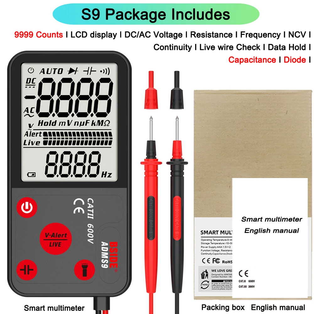 Цифровой мини-мультиметр BSIDE, 9999 EBTN дисплей, мультиметр, вольтметр постоянного и переменного тока, тестер емкости, диода, Бесконтактный индикатор напряжения, Омметр, проверка непрерывности в реальном времени, Гц