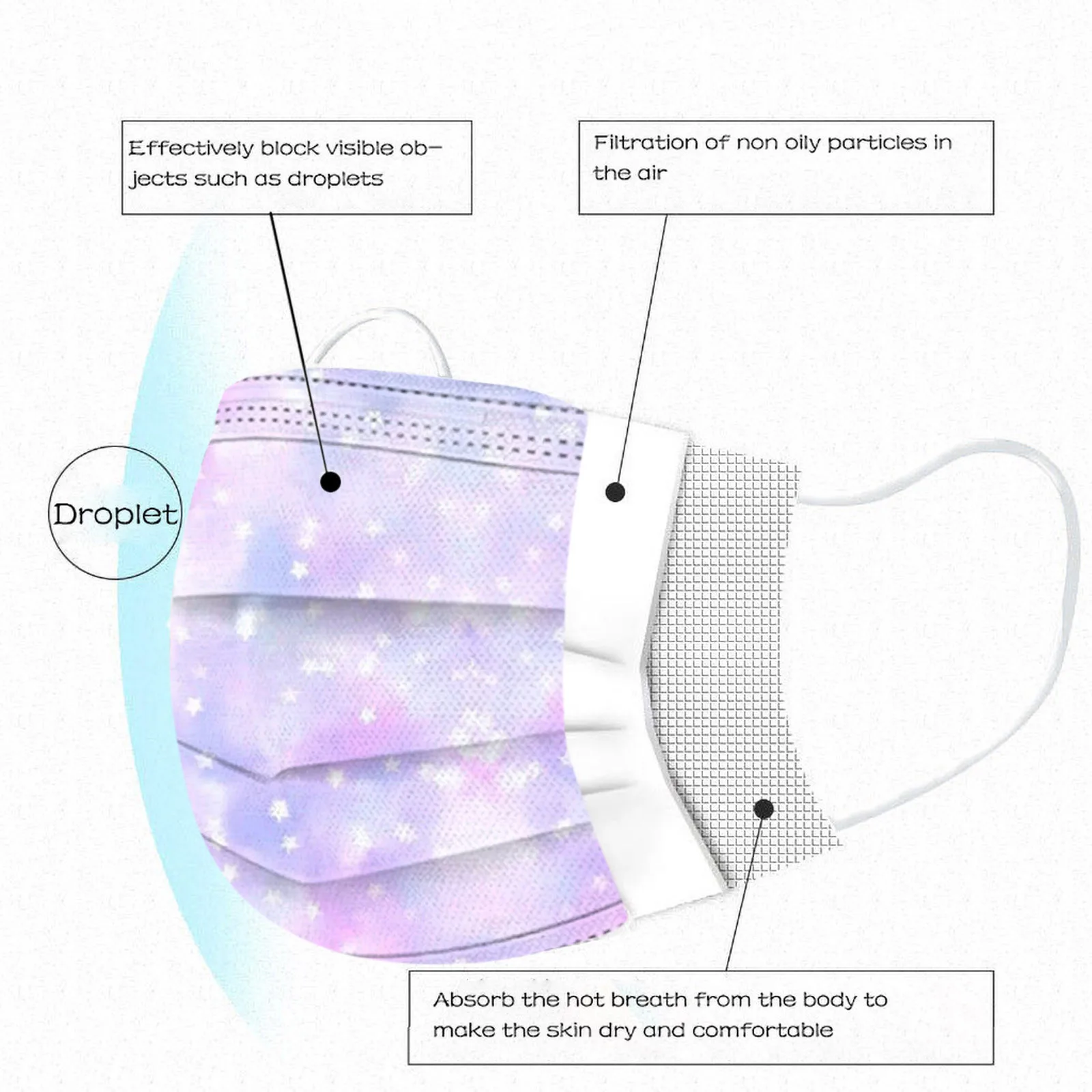 В 3 слоя Нетканая одноразовая маска изготовлена из 3 слоев нетканого материала, Безопасен и безопасен для использования. Дышащий материал и милый Узоры, которые делают его полезным и модным. Специальный 3 слоя из нетканого материала Дизайн, обеспечивает некоторую защиту от пыли, автомобильных выхлопных газов, Пыльца и т. д. эластичная Ушная петля, легко носить и не давит на уши. Маникюрный салон или любые другие области, где может потребоваться защита