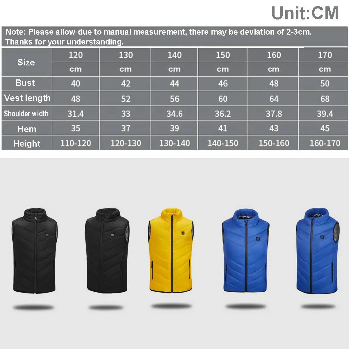 Спецификация:-Размер длины: 120 см, 130 см, 140 см, 150 см, 160 см, 170 см (опционально)-Цвет: синий, желтый, черный (по желанию)-Материал: полиэстер-Интерфейс питания: USB-Источник питания: 5 В/2 а портативный источник(Не входит в комплект)-Зона лихорадки: 3 зоны нагрева