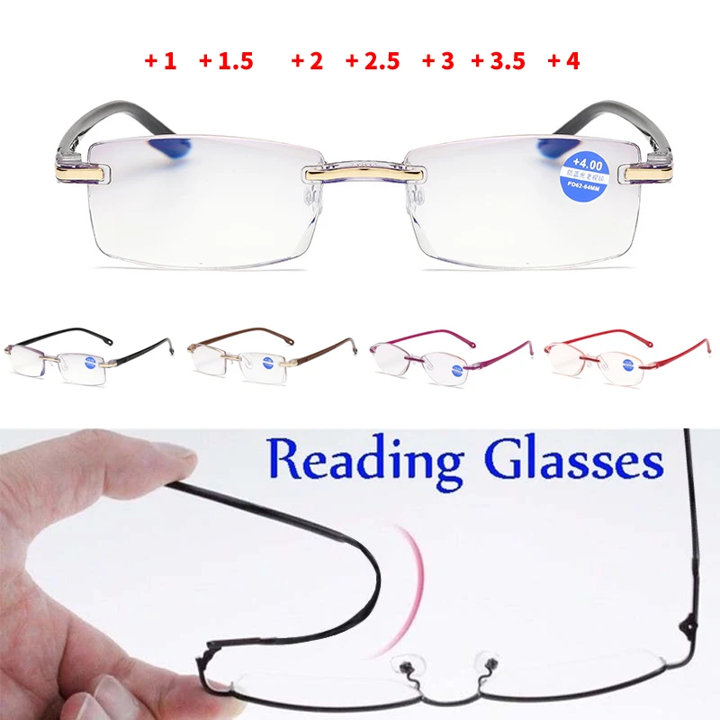 Очки для чтения без оправы с алмазной огранкой и защитой от синего светильник со встроенной пленкой для мужчин и женщин + 1,0 + 1,5 + 2,0 + 2,5 + 3,0 + 3,5 + 4,0