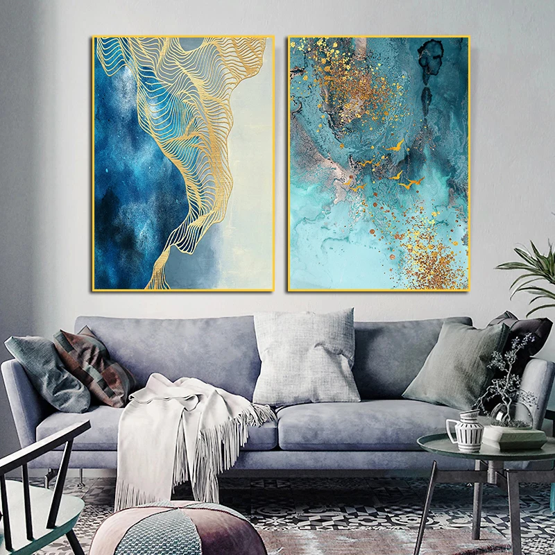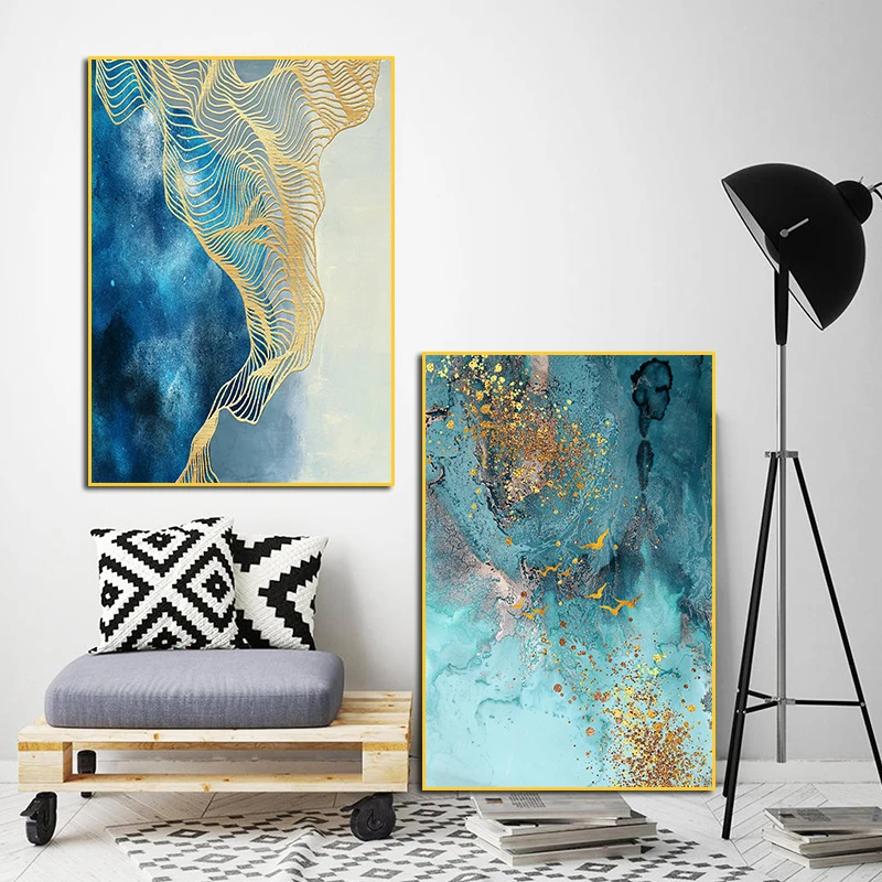 Абстрактная Роскошная золотая линия синяя фотокартина на холсте настенные художественные картины и постеры квадраты для гостиной домашний декор