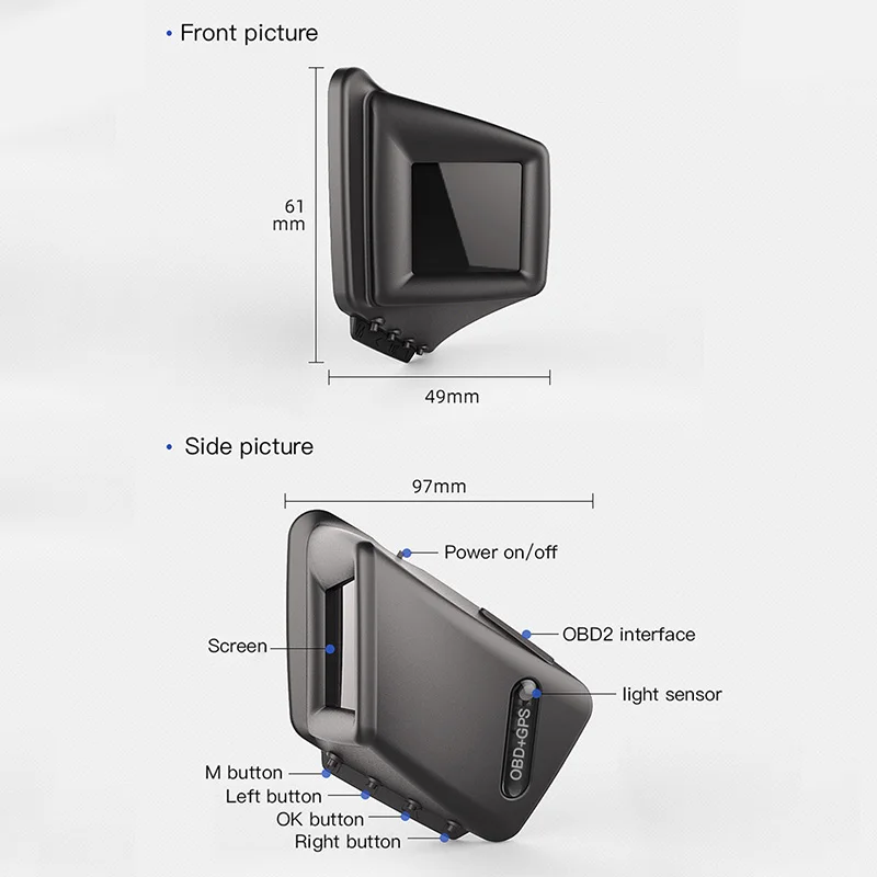 OBD + GPS 2 в 1 двойная рабочая система, которая может работать на всех транспортных средствах.Если OBD несовместим, перейдите на страницу настройки, чтобы переключить Рабочий режим в режим GPS: Держите скорость на 0, И нажмите кнопку «ОК», чтобы перейти на страницу настройки → Настройка → выключатель OBD → включение/выключение, выберите переключатель OBD, затем устройство войдет в режим работы GPS.1. Отображение информации о режиме OBD: скорость транспортного средства, температура воды, температура масла, напряжение, расход топлива, об/мин, один пробег, общий совокупный пробег, время в пути, системное время, давление впуска, соотношение воздуха и топлива, давление турбины, давление впуска, испытание на ускорение, испытание тормозов, ПИД-данные, считывание потока данных.Сигнализация: сверхскоростная сигнализация, скоростная сигнализация, высокая температура воды, Сигнализация низкого напряжения, сигнализация неисправности двигателя, четкий код неисправности, свободное переключение между километром и милями, переключатель Цельсия и Фаренгейта свободно (°C и switch Переключатель), км/ч и миль/ч переключатель, бар и PSI переключатель...2. Отображение информации о режиме GPS: скорость, время в пути, Спутниковое время, высота, количество спутников, направление движения, один пробег, напряжение, испытание на ускорение, испытание тормозов.Сигнал тревоги: сигнал тревоги, сигнал низкого напряжения, свободное переключение между километром и милями, км/ч и миль-переключатель...
