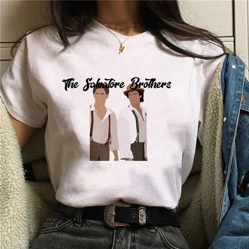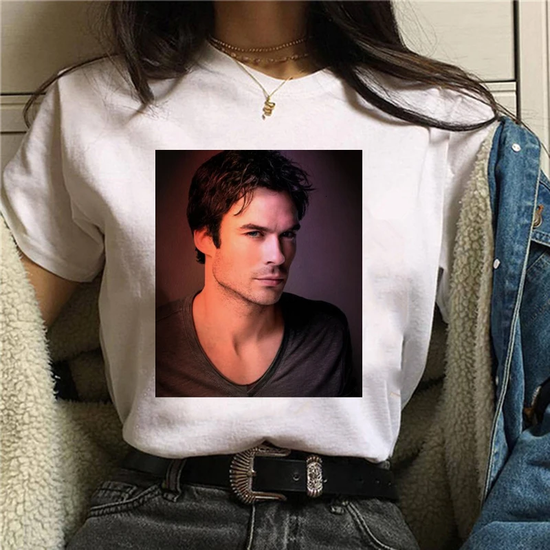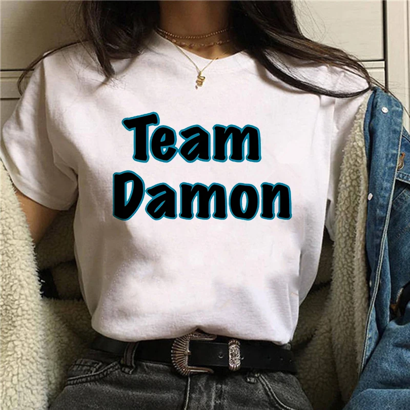 Футболка женская с принтом вампира, уличная одежда с коротким рукавом, топ с принтом Деймона Сальватора в стиле Харадзюку, лето 2021