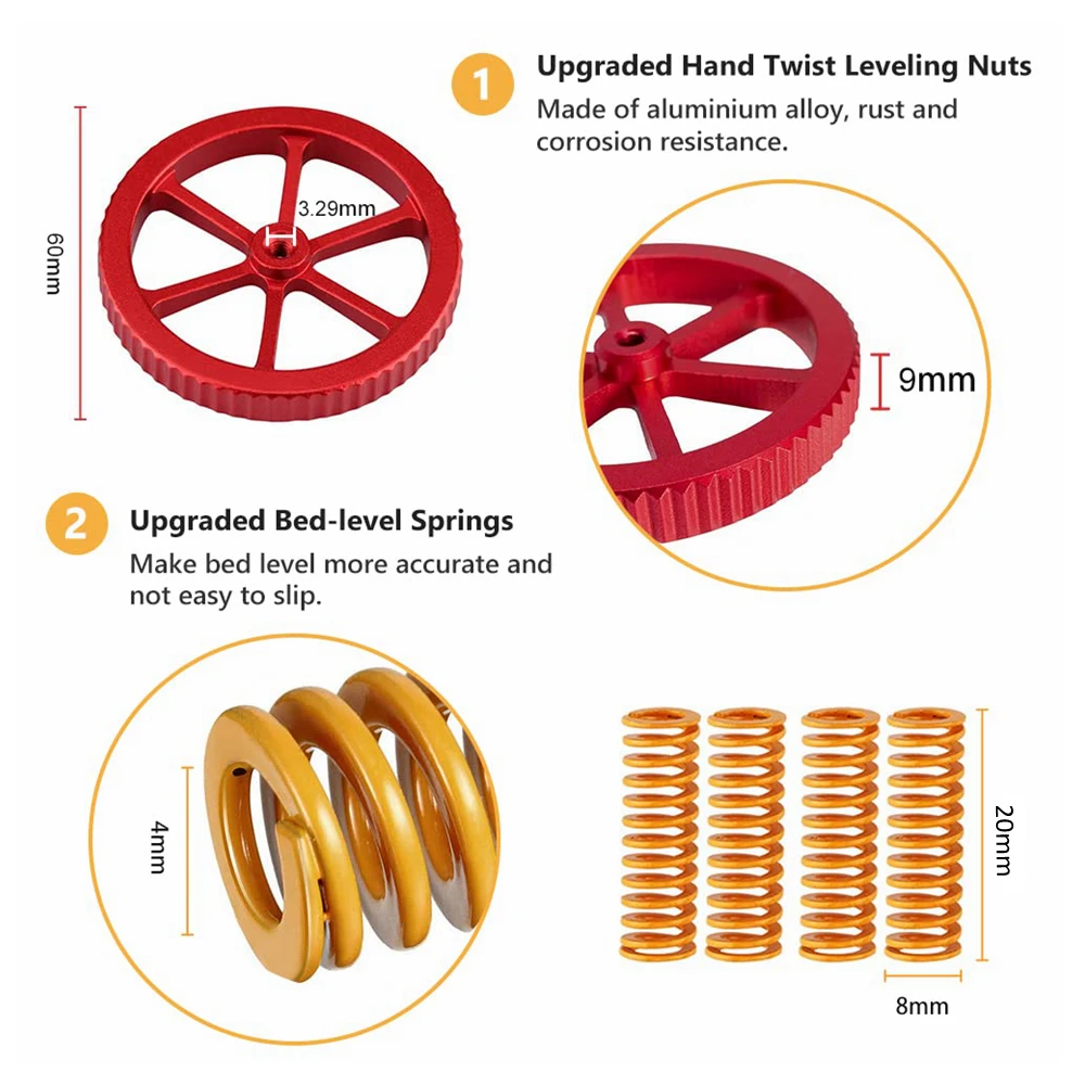Модернизированная алюминиевая гайка с ручным поворотом. Эти красные Алюминиевые гайки являются оригинальной обновленной запасной частью для Ender 3/3 Pro/3 X, Ender 5/5 Plus/ 5 Pro, CR-10, CR-10 V2, CR-10 Max, CR 10, CR-10 Mini, CR-10S, CR 10S Pro, CR-10 Plus, CR-X, CR 20.2. Последние годы. Изготовлено из высококачественного алюминия, срок службы ваших пластиковых орехов намного больше.3. Металлическая гайка более мощная и будет крутить более плотно, чем пластиковые гайки.4. Крутящий момент этих гаек большой, что упрощает настройку горячей кровати.Посылка включает в себя:4 шт. красная алюминиевая винтовая гайка + 4 шт. желтая пружина.Примечание: пружины длиной около 20 мм, что больше, чем ender 3 и ender 3 профессиональный принтер. Вы можете использовать инструмент, чтобы сократить его, чтобы быть короче, если вам действительно нравится этот продукт или настроить горячую кровать, чтобы быть выше, чтобы соответствовать пружинам.