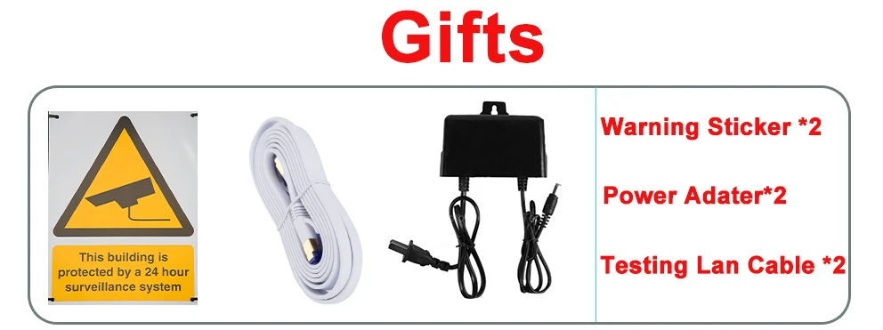 4. Сетевой LAN кабель для тестирования (около 1 м) + адаптер питания для тестирования (ЕС/Великобритания/Австралия/США) + стикер тревоги * 2;