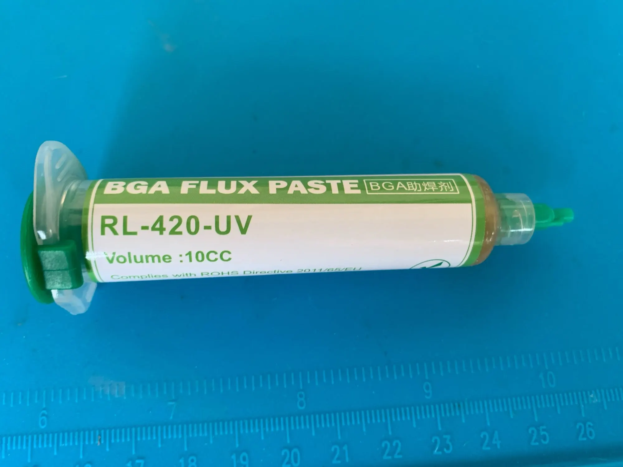 Флюс белый, наподобие RMA-218. Пахнет так же, но паяет плохо: Под феном вообще не припаял шар, а под паяльником активность никудышная. 420й справился лучше. Вероятно, 422й заточен для БГА. Но подробности узнаем, когда я проведу полноценный тест. Будет на канале RusFlux Info.