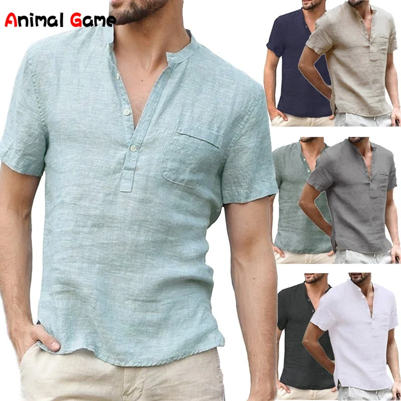 Футболка мужская льняная с воротником-стойкой, пикантная рубашка из...