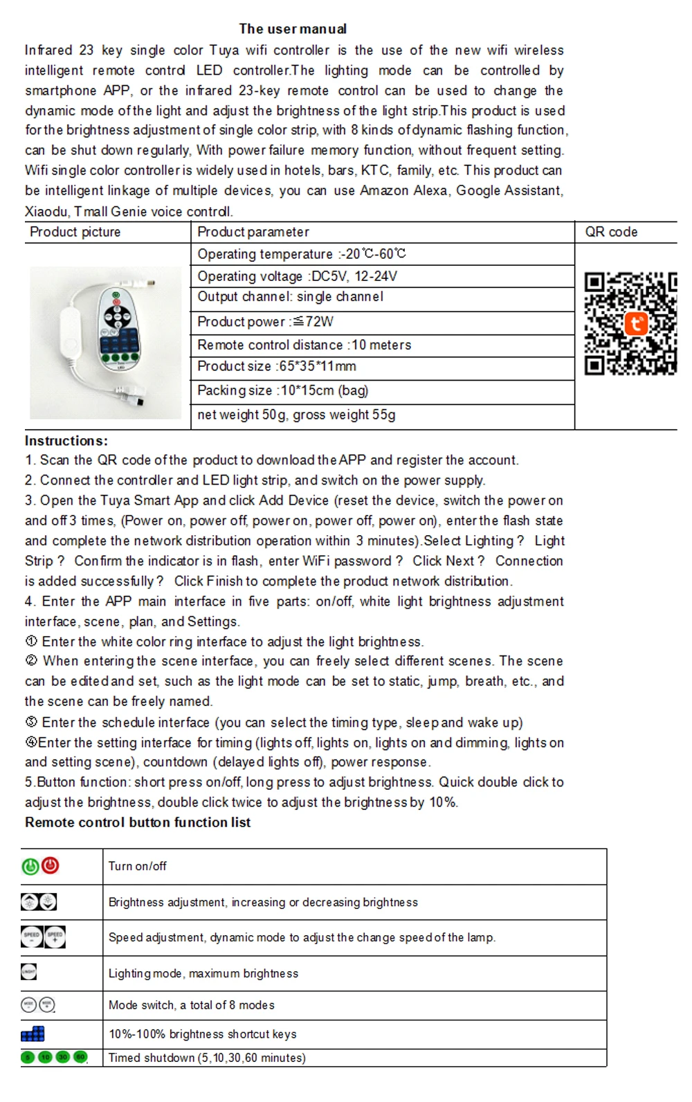 Инфракрасный 23 ключ один цвет Tuya контроллер Wi-Fi-это использование Новинка Wi-Fi беспроводной интеллигентая (ый) дистанционный пульт светодиодный контроллер. Режим освещения может быть управления Светодиодный Смартфон APP, Или инфракрасный пульт дистанционного управления с 23 клавишами может использоваться для изменения динамического режима светильник и регулировки яркости полосы светильник. Этот продукт используется для регулировки яркости одноцветной полосы,С 8 видами динамической мигающей функции, Может быть отключен регулярно, с функцией памяти отключения питания, без частого настройки. Wifi Одноцветный контроллер широко используется в гостиницах, барах, KTC, семье и т. д. этот продукт может быть интеллектуальным соединением нескольких устройств,Вы можете использовать Голосовое управление Amazon Alexa, Google Assistant, Xiaodu, Tmall Genie.