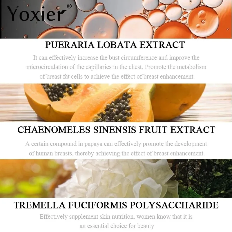 Экстракт пурарии лобата может эффективно увеличить обхват груди и улучшить микроциркуляцию капилляров в груди. Способствует метаболизму клеток грудного жира для достижения эффекта повышения груди. Chaomeles SINENSIS фруктовый экстракт определенного соединения в папайи может эффективно способствовать развитию человеческой груди, тем самым достигая эффекта увеличения груди. TREMELLA FUCIFORMIS полисахарид эффективно дополняет питание кожи, женщины знают, что это важный выбор для красоты