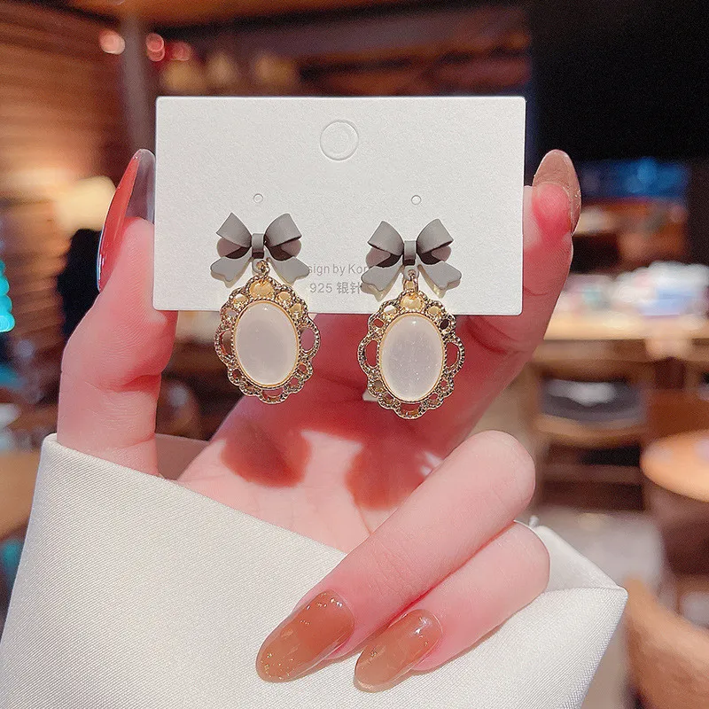 Золотые висячие серьги с бантом и полым опалом, милые корейские модные длинные серебряные серьги с кисточками для женщин, ювелирные изделия