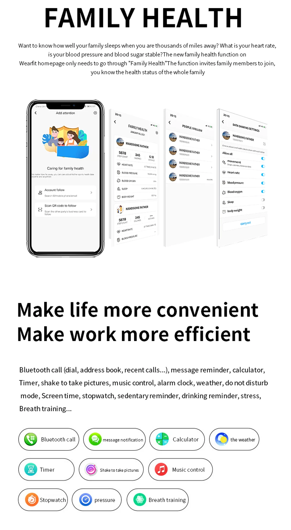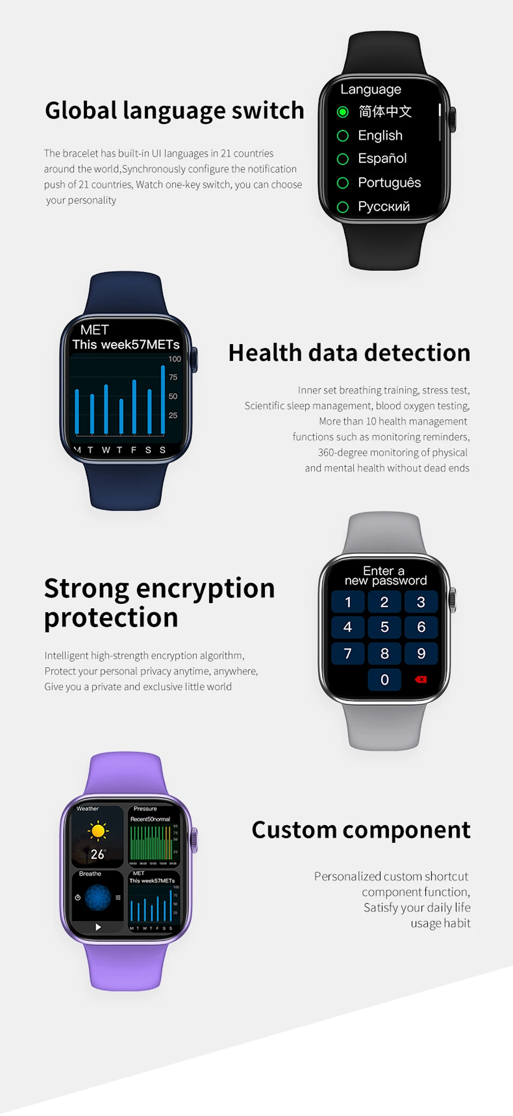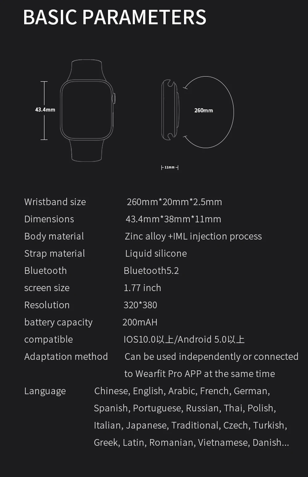 HW56 плюс параметры1. Модель: HW56 Plus2. Беспроводное зарядное устройство3. Материал корпуса: цинковый сплав4. Материал ремешка: силикон5. Экран: квадратный экран TFT6. Экран Размер: 1,77 дюймов7. Разрешение: 320*3858. Чип: HS66219. Датчик сердечного ритма: SC7R3010. Память: 64 м11. Bluetooth: 5,212. Емкость аккумулятора: 200 мАч13. Способ зарядки: Беспроводная зарядка14. Срок службы батареи: около 2-5 дней15. Время работы в режиме ожидания: 65 дней16. Режим касания: Полное касание17. Водонепроницаемость: Водонепроницаемость IP67, не рекомендуется непосредственно касаться воды18. Приложение: WearFit pro19. 44 мм сменный ремешок20. Системные требования: Android 5,0 + / IOS 19. Системные требования: Android 5,0 + / IOS 10,0 +Функции1. Следите за своим здоровьем:Трекер сна, напоминание о сидячем положении, пульс/кровяное давление/мониторинг кислорода в крови.2. Хороший помощник для тренировки:Шагомер, сожженные калории, расстояния, спортивные режимы.3. Хороший помощник для повседневной жизни:При подключении к телефону: Синхронизация уведомлений (напоминание о входящих звонках, сообщения и т. Д.), музыка bluetooth и т. Д.Приложение с раздельным экраном, 3d-динамическим циферблатом, погодой, поднятием запястья, будильником, секундомером, поиском моего устройства, калькулятором и т. д.ЯзыкиЯзыки пользовательского интерфейса: китайский (упрощенный/традиционный), английский, арабский, французский, немецкий, испанский, португальский, русский, тайский, польский, итальянский, японский, чешский, турецкий, греческий, латинский, румынский, вьетнамский, датский. НедерлендыЯзыки приложения: китайский (упрощенный/традиционный), английский, французский, немецкий, японский, испанский, итальянский, корейский, русский, тайский, чешский, португальский, индонезийский, арабский, турецкий, греческий, эстонский, болгарский, латышский, литовский, румынский, сербский, словацкий.Упаковочный лист:Головка машины * 1,Ремешок для часов * 1,Руководство * 1,Беспроводной зарядный кабель * 1Уведомление1. Результаты измерений этого продукта только для справки, а не для каких-либо медицинских целей или основы. Пожалуйста, следуйте инструкциям врача и никогда не ставьте самодиагностику и лечение на основе результатов измерений.2. Класс водонепроницаемости этого продукта составляет IP67, и его нельзя использовать для глубокого погружения и длительного замачивания в воде. Кроме того, этот продукт не устойчив к горячей воде, потому что водяной пар повлияет на кольцо руки.