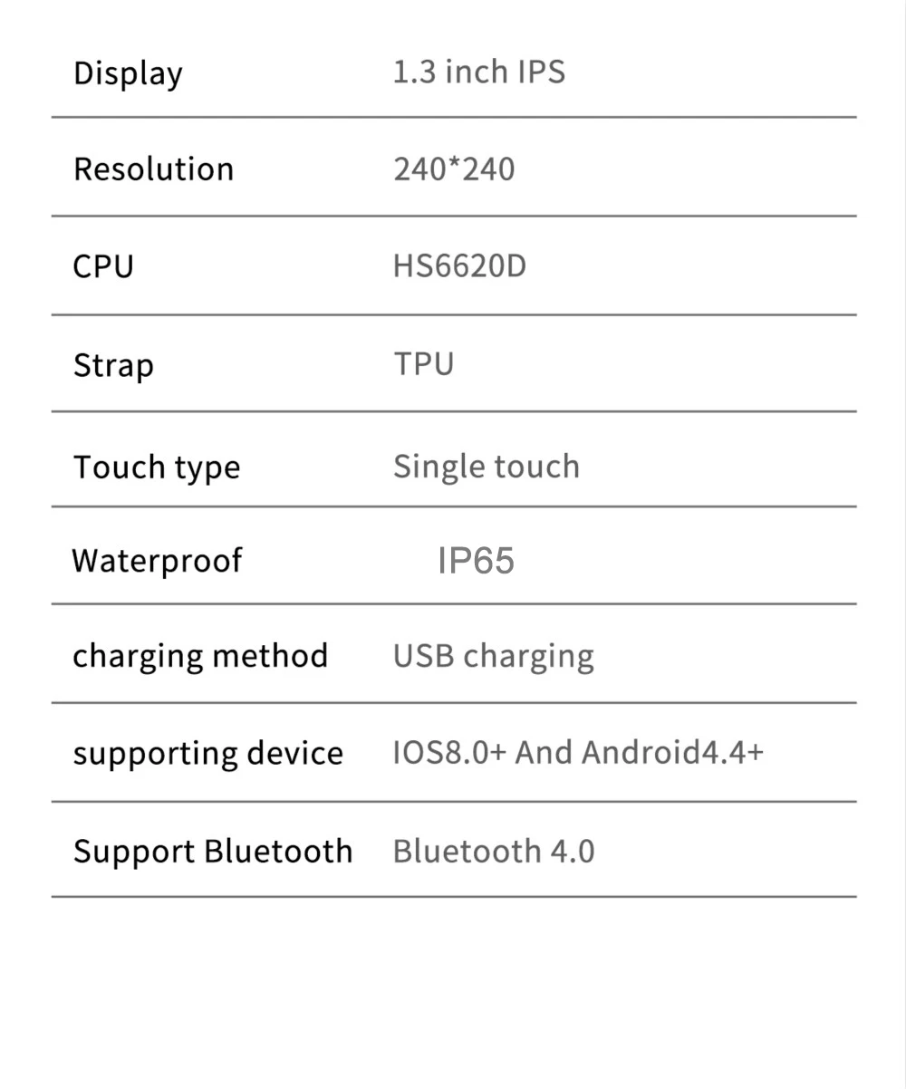 Тип сенсора: Полное касаниеВерсия BT: BT4.0 или вышеВодонепроницаемость: IP67 водонепроницаемый и пыленепроницаемый (не поддерживает плавание и принимать душ).