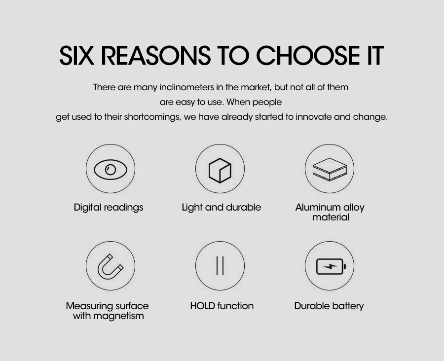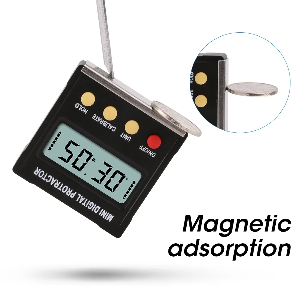 【Высокое Качество 】: этот угловой Инклинометр компактный и легкий, который изготовлен из алюминиевого сплава и АБС, удобно носить с собой и хранить. Большой, четкий ЖК-экран удобен для вашего использования, позволяет легко и четко считывать значение углов.[Любые измерения угла]: инструмент локатора для измерения любого угла. Этот цифровой угловой локатор может измерять в абсолютных или относительных измерениях для определения точного угла или разницы между 2 углами. Точность этого мини цифровой транспортир 0,1 ° и диапазон измерения: от 4*90 °.【Магнитное Основание: встроенный в 3 блока сильного магнита, это магнитное основание позволяет этому цифровому датчику угла быть прикрепленным к измерительной заготовке объекта.【 Многофункциональность: относительное и абсолютное измерение может быть изменено в любом положении. И оснащен градусом и процентом наклона в преобразовании. Этот цифровой искатель имеет четыре функциональные кнопки включения/выключения, установки, калибровки и удержания, что делает вашу работу более простой.【Широкое Применение: наш мини-цифровой транспортир небольшой и компактный, но Высокоточный цифровой угол. Он имеет достаточные возможности для среднего домашнего пользователя, чтобы настроить лезвие пилы стола. Он обеспечивает быстрое и точное измерение в автоматическом ремонте, производстве машин, конструировании, деревообработке, телекоммуникациях и украшении.