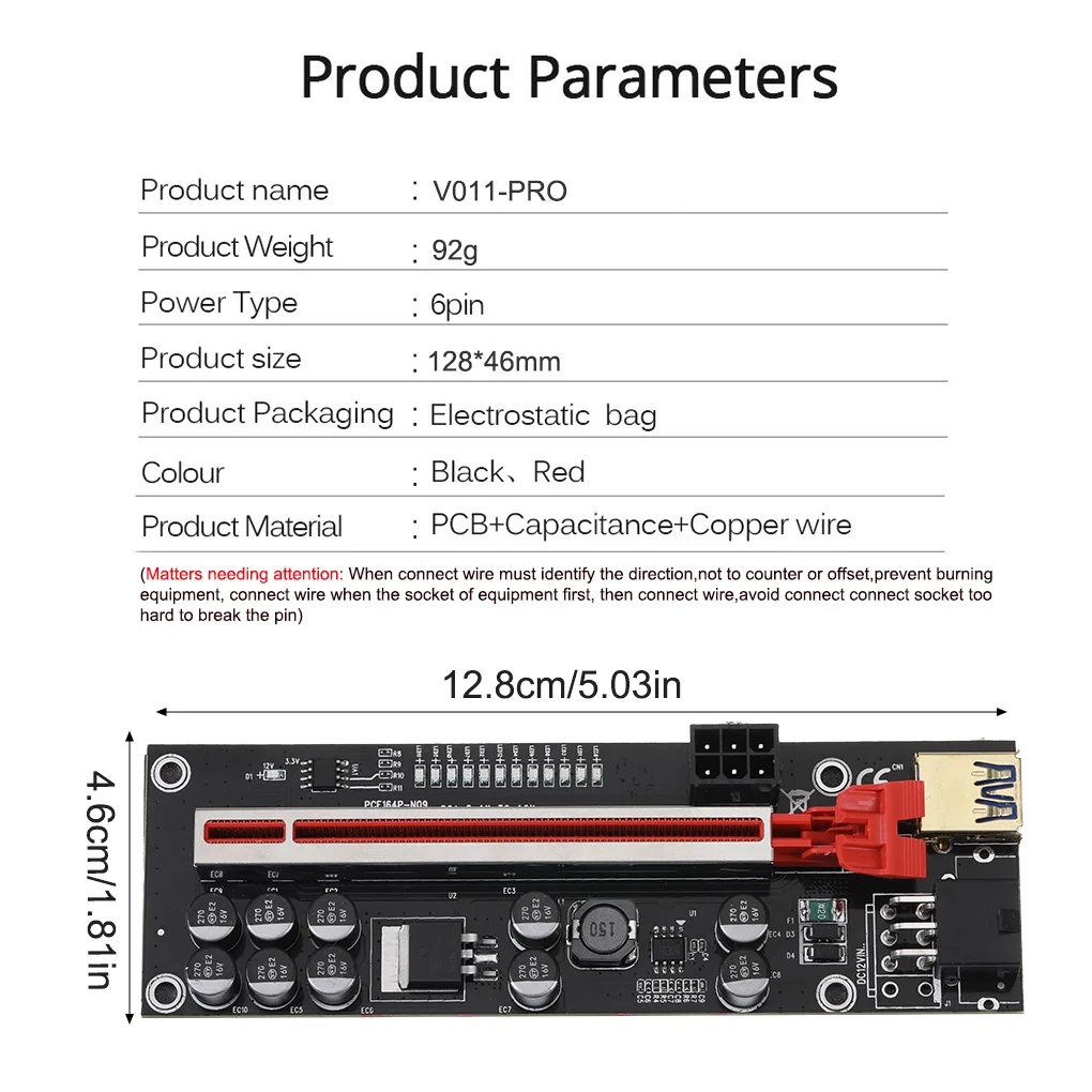 Опишите:10 конденсаторов: Эта плата адаптера PCI-E предназначена с 10 конденсаторами для обеспечения нормальной и стабильной работы платы.Светодиодный индикатор: Эта плата расширения PCI-E проста в использовании, есть 13 светодиодный индикатор, чтобы показать рабочий статус.6-pin источника питания: Этот адаптер PCI-E доска использует 6-pin интерфейс для источника питания, зависит от материнской платы.Кабель USB 3,0: Эта плата адаптера PCI-E поставляется с usb-кабелем, поддерживает USB 3,0 и обеспечивает высокоскоростную скорость передачи данных.Идеально подходит для майнинга: Эта плата расширения PCI-E специально разработана для майнинга, что позволяет добавлять больше графических карт на сервер.Спецификация:Длина кабеля USB: около 60 см/23,62 дюйма.Цвет слота: черныйЦвет кабеля: красный.Размеры (Длина x Ширина x высота): прибл. 130x45x1 5 мм/51,18x17,72x5,91 дюйм (ов).Примечания:Из-за различных компьютерных разрешений могут быть некоторые искажения цвета.