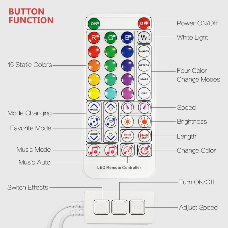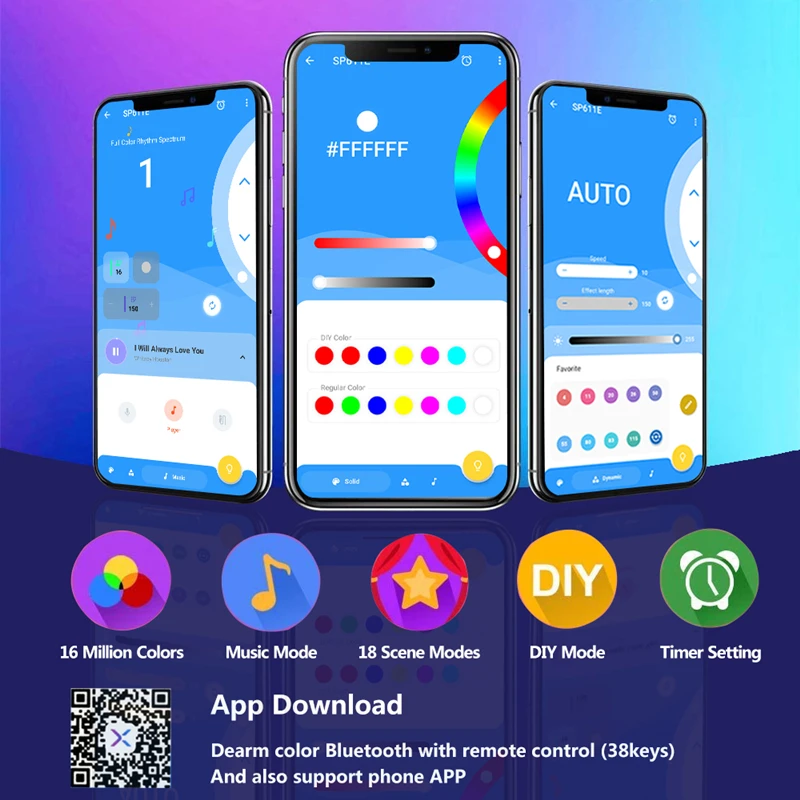 Особенности светильник мечты:1. Поддержка Bluetooth APP управления и инфракрасного дистанционного управления.2. Встроенный микрофон с музыкой и немузыкальными эффектами, мульти-Параметр регулируется.3. Функция автоматического сохранения заданных параметров.Светильник Длина ленты: 5 м/10 м/15 м/20 м/30 мМетод контроллера:1. 38-клавишная инфракрасный дистанционный пульт (без батареек).2. Bluetooth Smart APP.3. Умный WiFi контроллерАдаптер питания: источник питания DC12V.Водонепроницаемость: IP65 водонепроницаемый/IP20 не водонепроницаемый.● Светодиодный светильник DreamColor бар: наш светодиодный светильник для музыки использует Улучшенный чип IC, который может быть красочным, как радуга сразу, с эффектами чеканки, прыжков и мигания. Более необычный и яркий, чем светодиодный RGB освещение.● Множество режимов изменения цвета: он поставляется с 18 режимами изменения цвета музыки и 142 режимами изменения цвета без музыки, которые являются яркими и красивыми. Он может автоматически изменить цвет или изменить цвет в соответствии с вашей командой в режиме non-music.● Статические цвета и яркость регулируются: если вы не хотите, чтобы музыкальный режим, настройте его на статический цвет, используемый для настройки освещения, например, белый, красный, зеленый, синий, И т. д. Яркость любого цвета можно регулировать.● Несколько приложений:1. Может использоваться для украшения автомобилей и велосипедов, рамы или контурного освещения.2. Широко используется для улучшения дома, гостиниц, клубов, торговых центров.3. Архитектурное декоративное освещение, изысканное освещение настроения.4. Широко используется для подсветки, скрытого освещения и освещения слотов.5. Аварийное и безопасное освещение, рекламный знак освещения.6. Декоративное освещение для фестивалей, мероприятий и выставок.