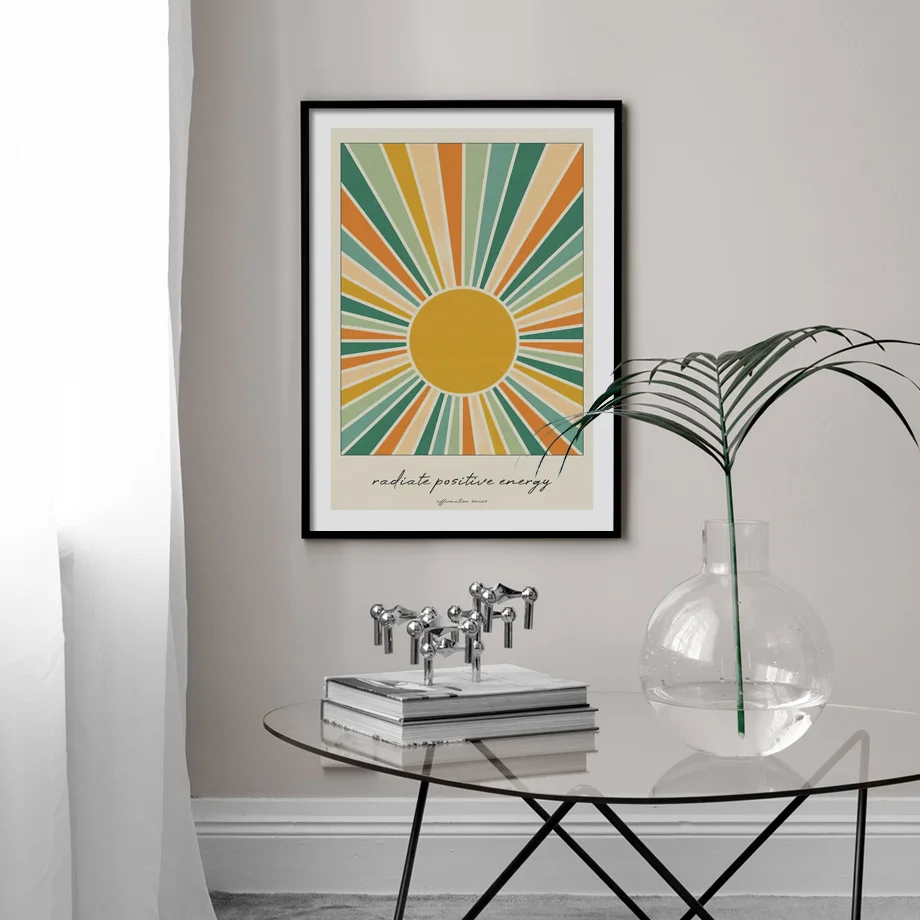 Абстрактный пейзаж, горы, солнце, озеро, отражение на стене, Художе...