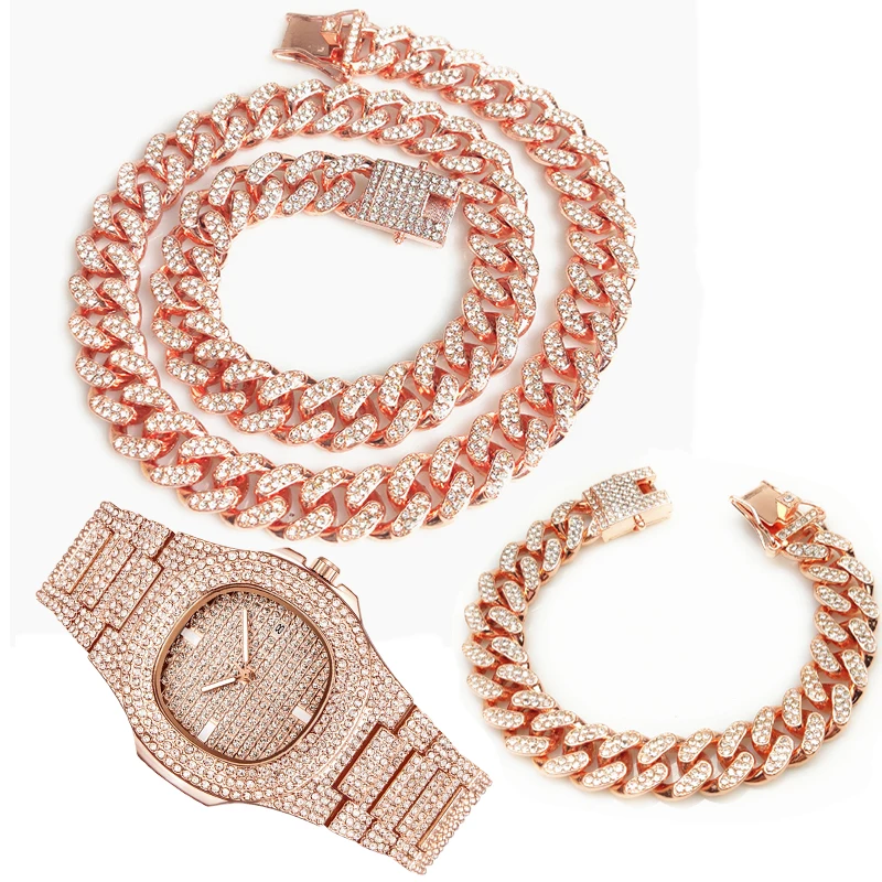 3 шт. в комплекте 13 мм хип-хоп Украшенные Стразы полное кубинское ожерелье Майами + часы + браслет Rapper для мужчин и женщин ювелирные изделия