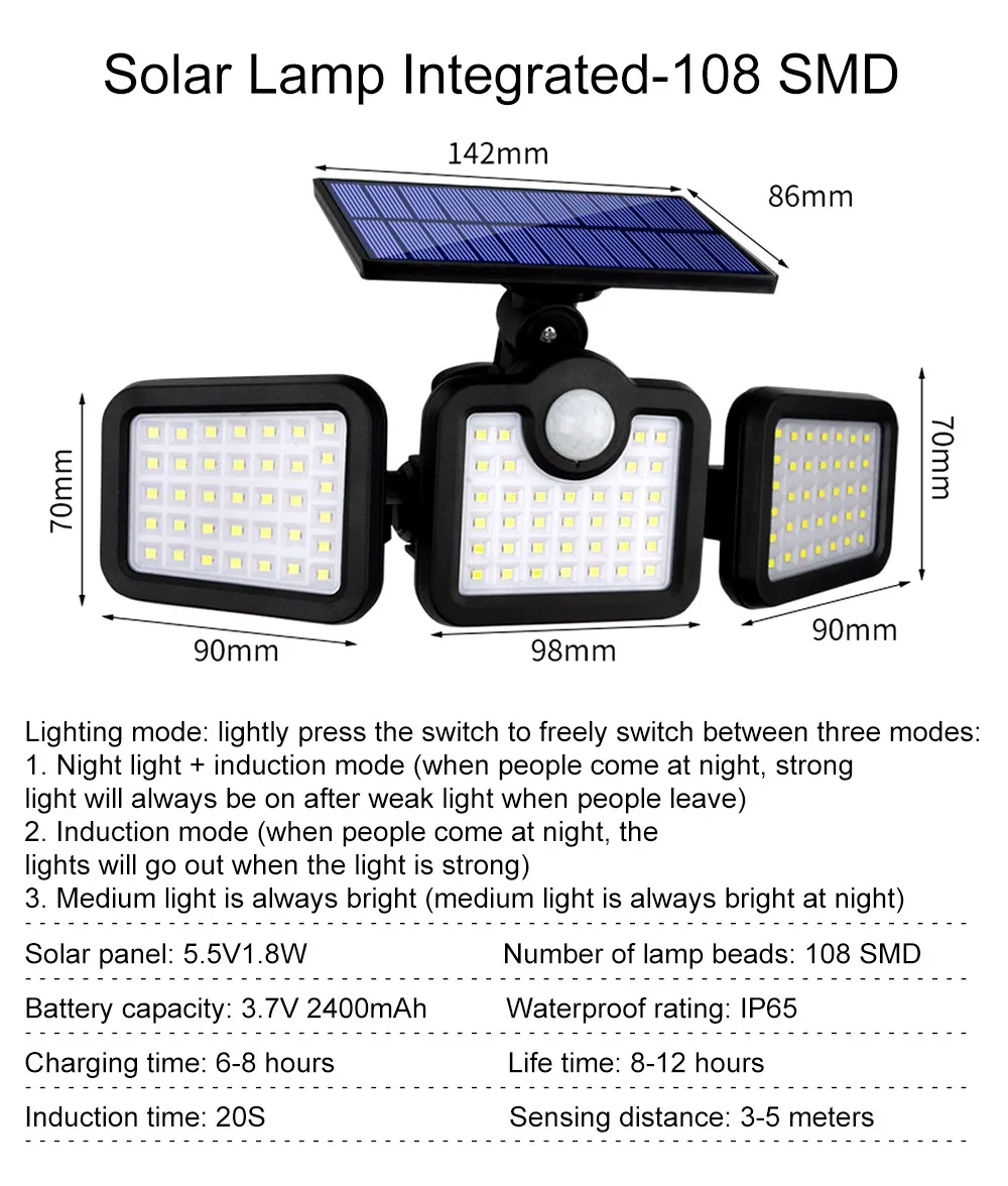 Светодиодный Кол-во: 108SMDСолнечная панель: 1,8 Вт, 5,5 ВЛитий-ионный аккумулятор Батарея: 3,7 V 2400mahСтепень водонепроницаемости: IP65Расстояние срабатывания: 16-26 футовУгол датчика: 120 градусовЦветовая температура: 6500KРежимы: выключение/датчикБезопасный материал: ABS + PC