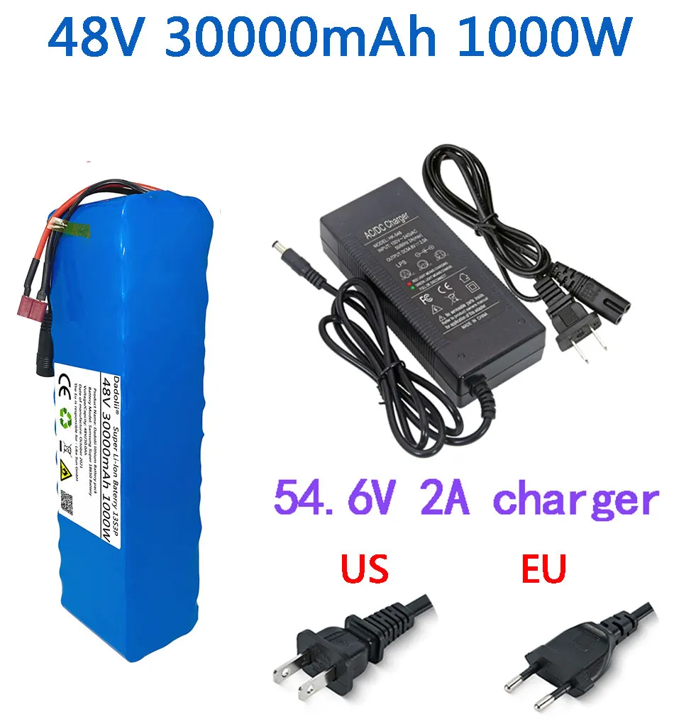 Аккумулятор для электровелосипеда, 48 В, 30 Ач, литий-ионный аккумулятор 18650 для велосипеда, скутера, электрического велосипеда, 1000 Вт с T-образной вилкой и зарядным устройством 54,6 в