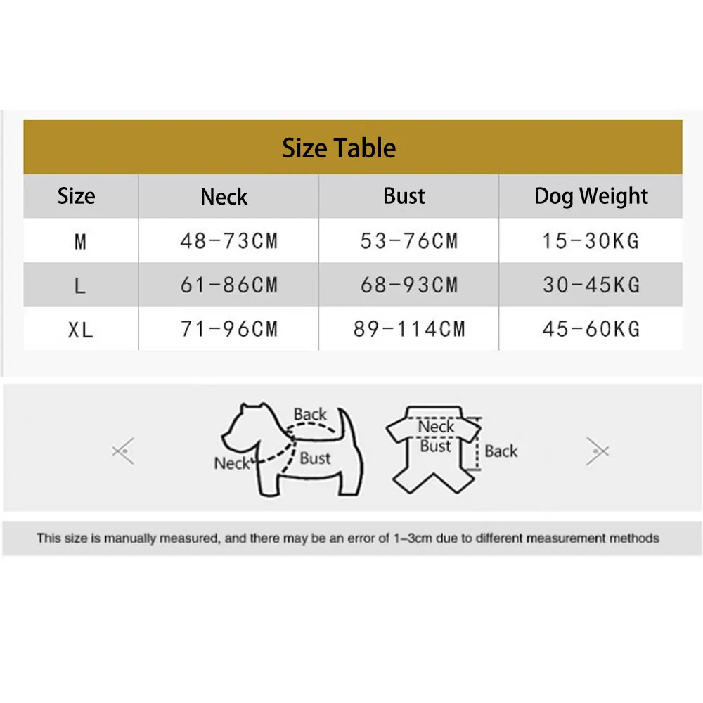 Доступно в 4 цветах и 3 размерах: измерьте обхват груди вашей собаки, чтобы подобрать подходящий размер. (Таблица размеров приведена на рисунке)