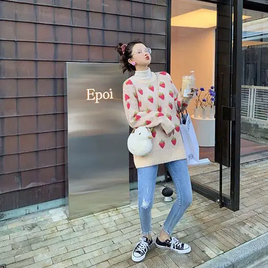 Женский свитер свободного покроя, свободный свитер в Корейском стиле с жаккардовым узором, свободный свитер в стиле «ленивый», универсальный повседневный тренд с длинным рукавом