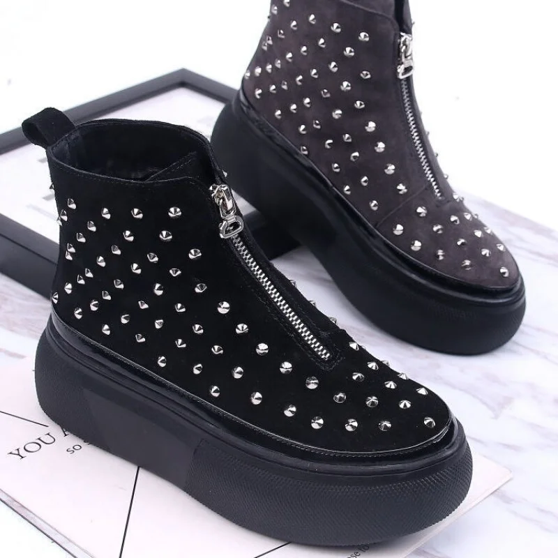 Новинка Осень-зима 2021, матовые замшевые короткие ботинки на толстой подошве с заклепками, полуботинки мартинсы с коротким рукавом и молнией спереди для женщин