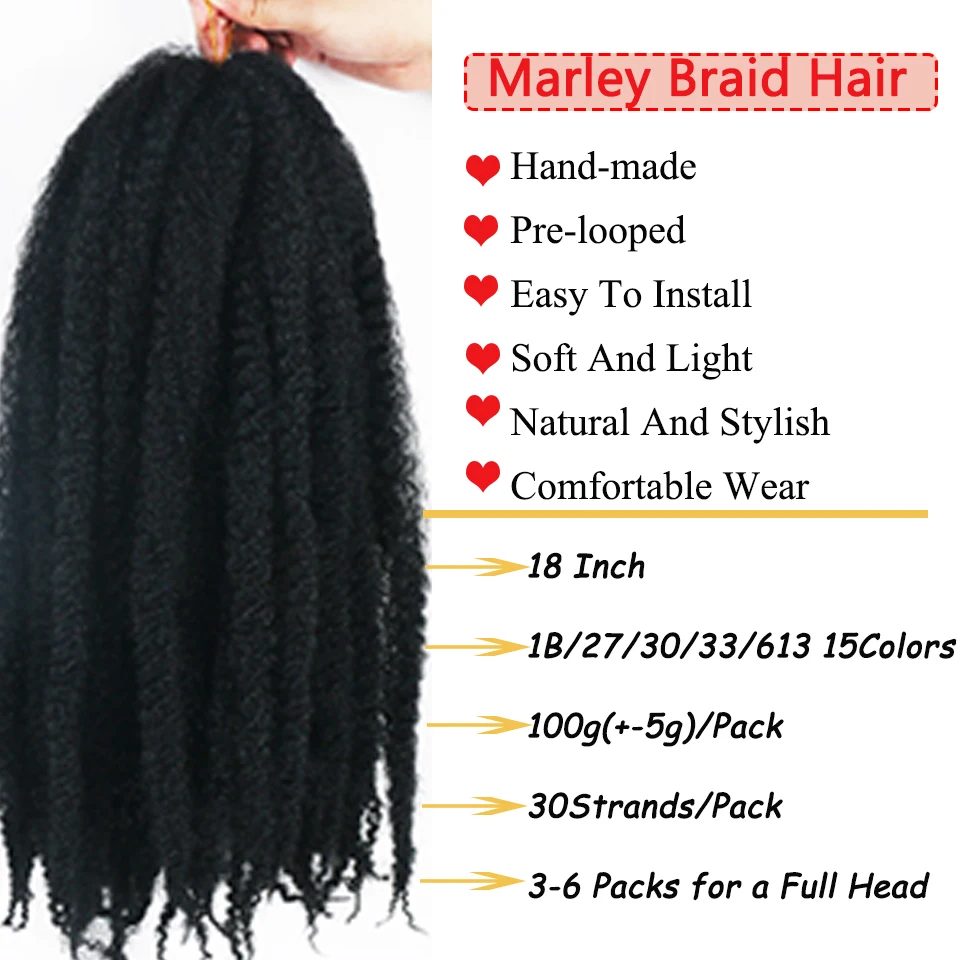 Материал волос: высокое качество, высокая температура, легкий стиль, огнестойкие волокна, синтетические волосы для наращивания.Простая установка и экономия времени: предварительно скрепленные и готовые крючком, могут быть установлены непосредственно.Стиль волос: плетеные волосы Marley, закрученные волосы Marley, новый стиль, мягкие плетеные волосы Locs для женщин.Цвет волос: # 1B/27/30/350/4/613/99j/ошибка чистый цвет T27/30/33/ошибка/серый/фиолетовый 2 цвета 15 цветов цвет s можно выбратьДлина и Вес волос: 18 дюймов 100 грамм (+-5g)/упаковкаКаждая упаковка: 30 прядей/упаковкаСколько упаковок для всей головы: обычно 3-6 упаковок достаточно полные;Преимущество волос: мягкий; Легкий; Не запутывается; Не линяет; Не пахнет; Естественный стильный вид; Долговечный.Примечание: Если у вас есть какие-либо другие вопросы, пожалуйста, свяжитесь с нами! Мы должны дать вам хороший ответ