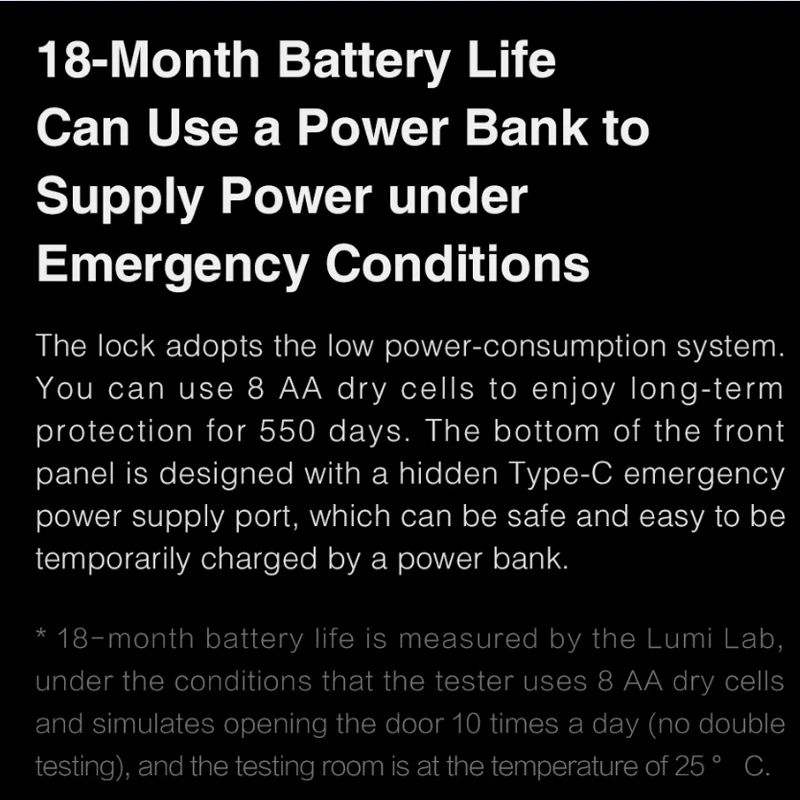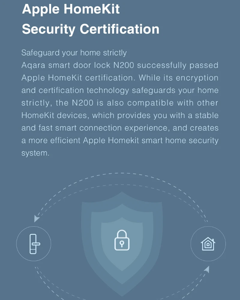 Модель продукта: Aqara N200Источник питания: 8 батарей AA (6 В постоянного тока, не входят в комплект), источник аварийного питания типа C (5 В постоянного тока)Емкость пользователя: 50 отпечатков пальцев, 50 постоянных паролей, 25 устройств NFC, 25 временных паролей, 8 временных паролейБеспроводное подключение: Bluetooth 5,0Исполнительный стандарт: GA 374-2019, GA/T 73-2015 (слот core), GB21556-2008Рабочая температура: -25 °C ~ + 70 °CРабочая влажность: 0 ~ 93% RH, без конденсацииУровень безопасности продукта: BУровень безопасности сердечника замка: Класс CЧип безопасности Mijia/Apple