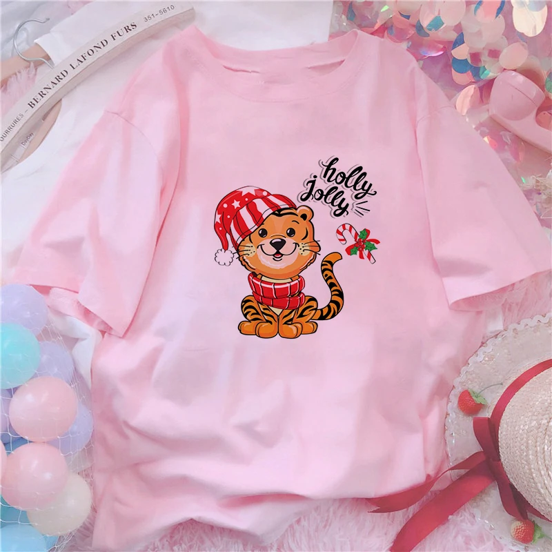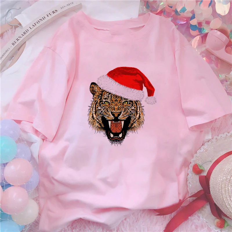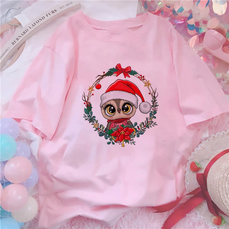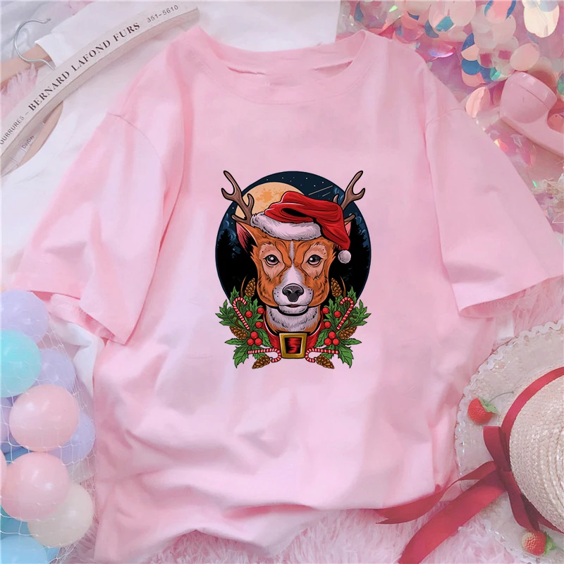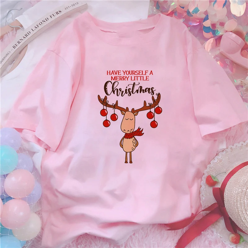 Женская рождественская футболка, модная футболка с принтом Санта-Клауса, женский розовый топ с забавным мультяшным оленем, женская одежда, футболка