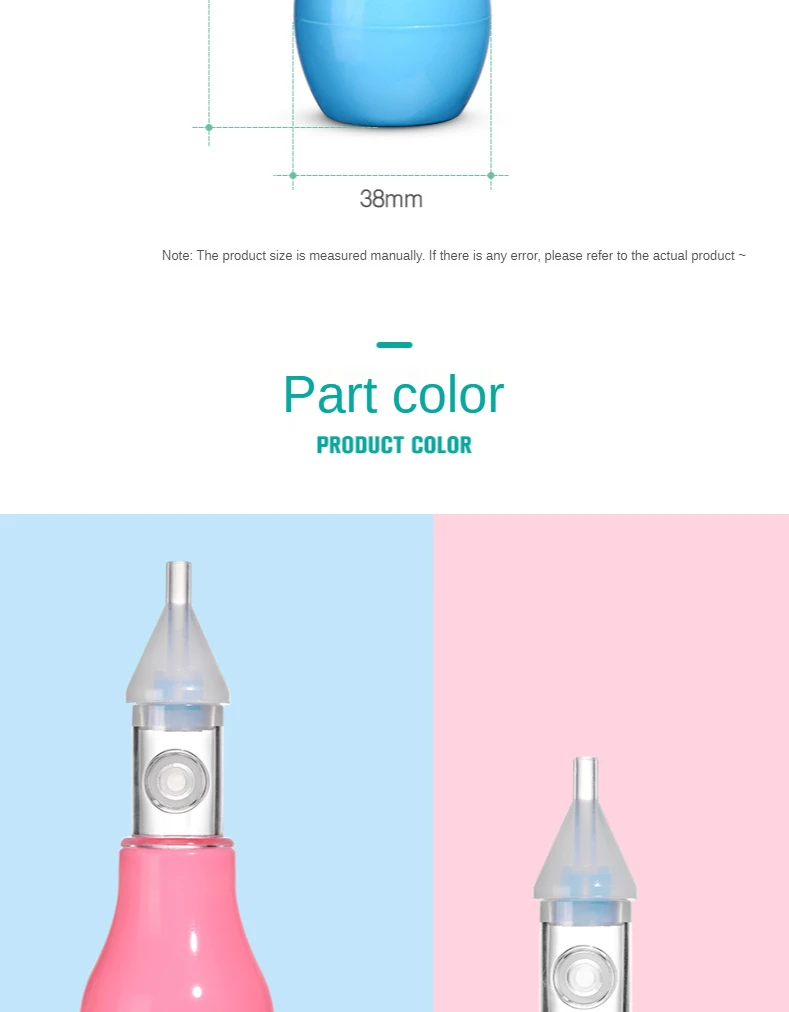 【Packing】Nude[Материал] полипропилен (PP24), плюс силикагель[Цвет] синий, розовый, желтыйКак использовать: при использовании сначала сжмите пластиковый насос, вставьте носовой аспиратор в ноздри ребенка, а затем расслабьте резиновый насос, чтобы высасывать носовые слизи. Рекомендуется использовать его после сна ребенка.ДляПримечание: Пожалуйста, промойте водой после использования.