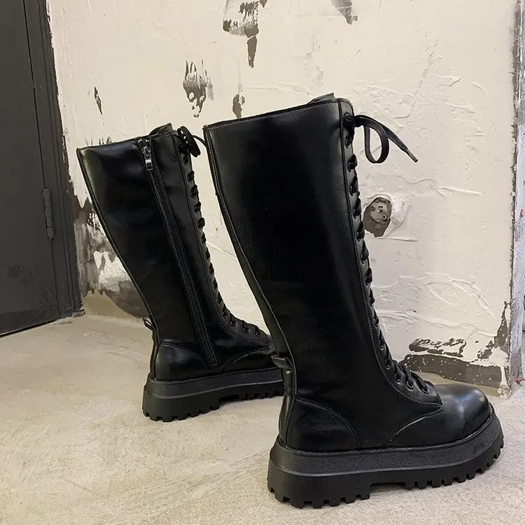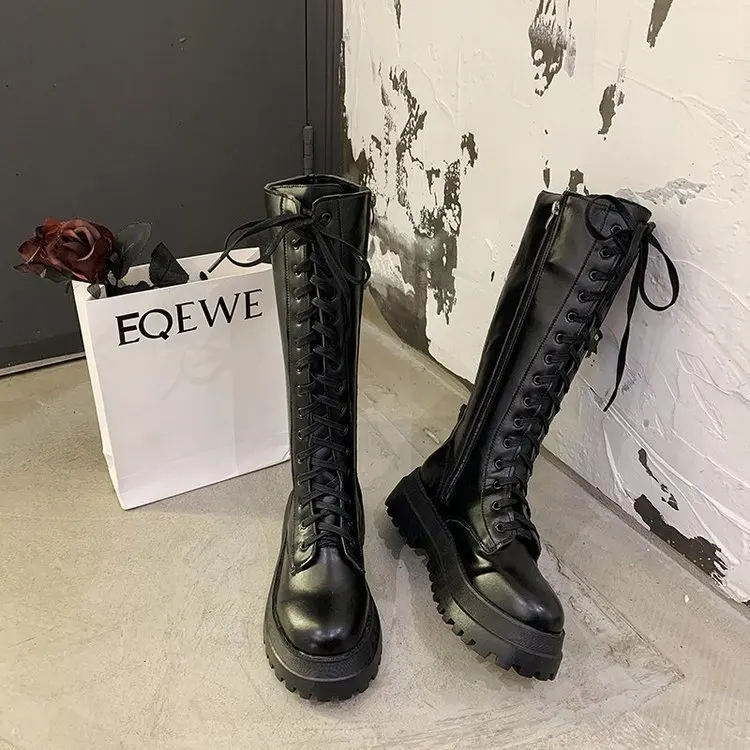Женские мотоциклетные ботинки на танкетке, ботинки из искусственной кожи на платформе и высоком каблуке, на шнуровке, обувь на плоской подошве, черные