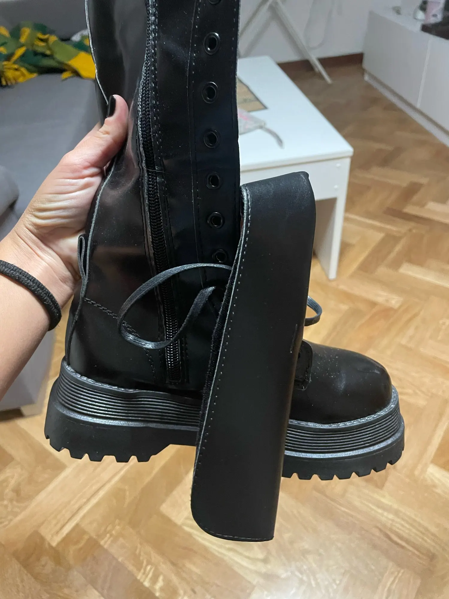 Черные женские высокие ботинки до середины икры на платформе в стил...