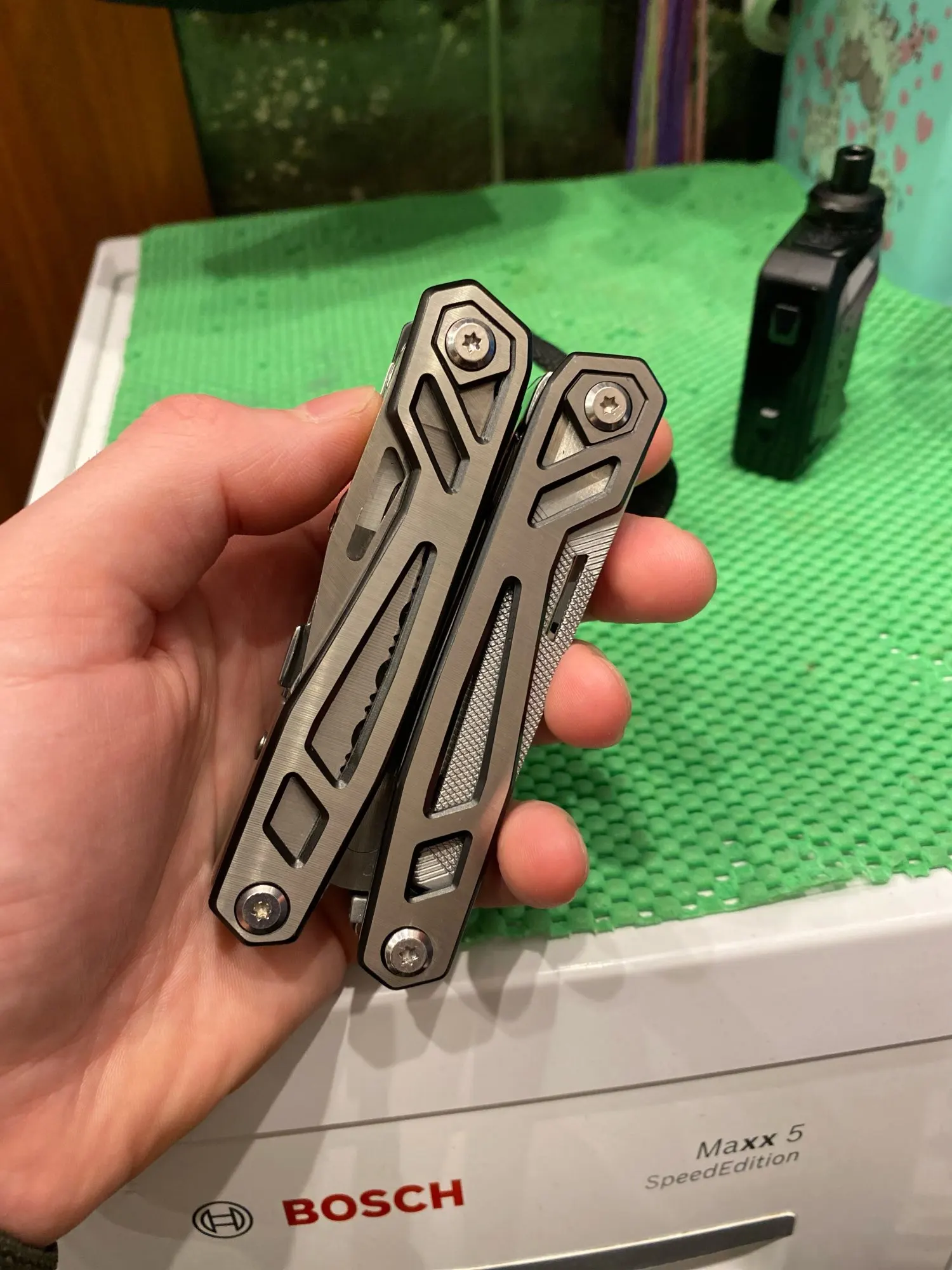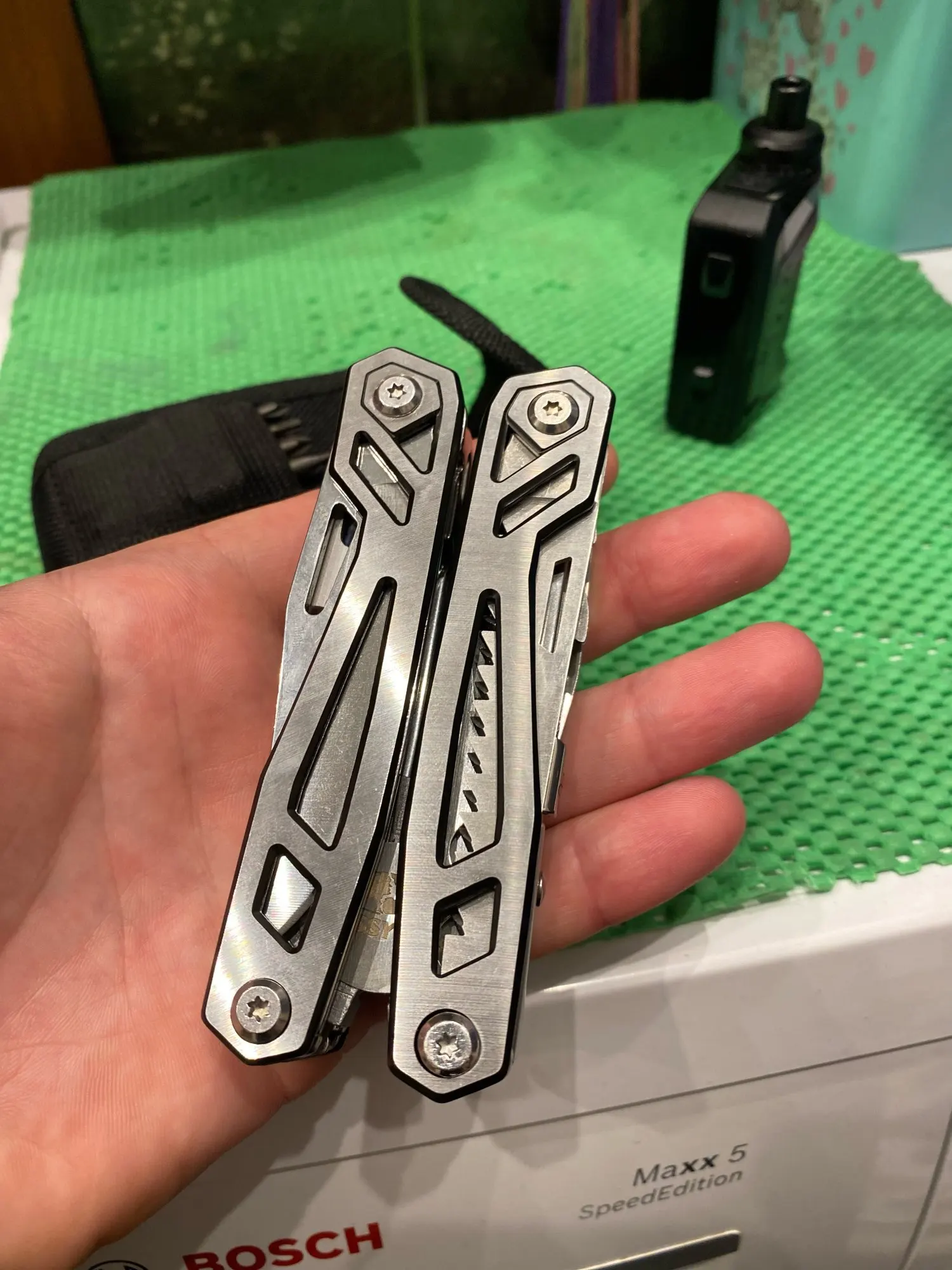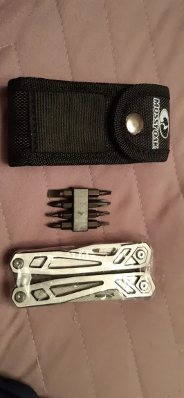 мощный ,крупный мультитул. всё работает четко фиксируются все инструменты,в комплекте нейлоновый поясной чехол,а в нём набор двухсторонних бит. я доволен покупкой.рекомендую!
